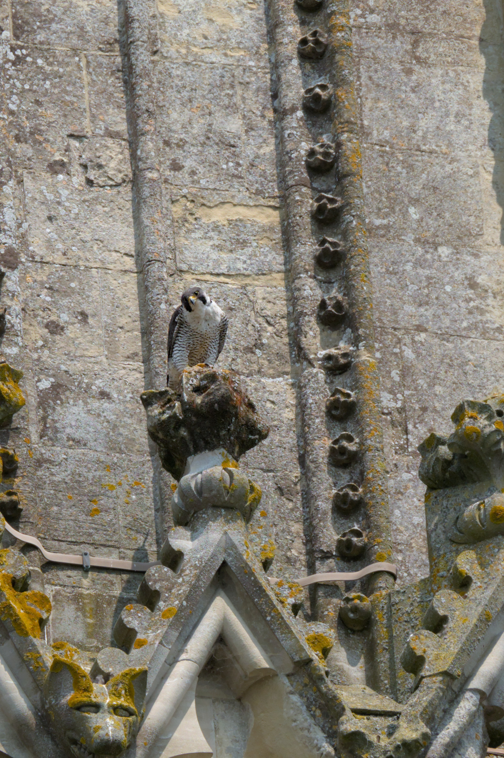 Peregrine falcon at Salisbury Cathedral. Probably the adult female. About 150 feet up so big crop.