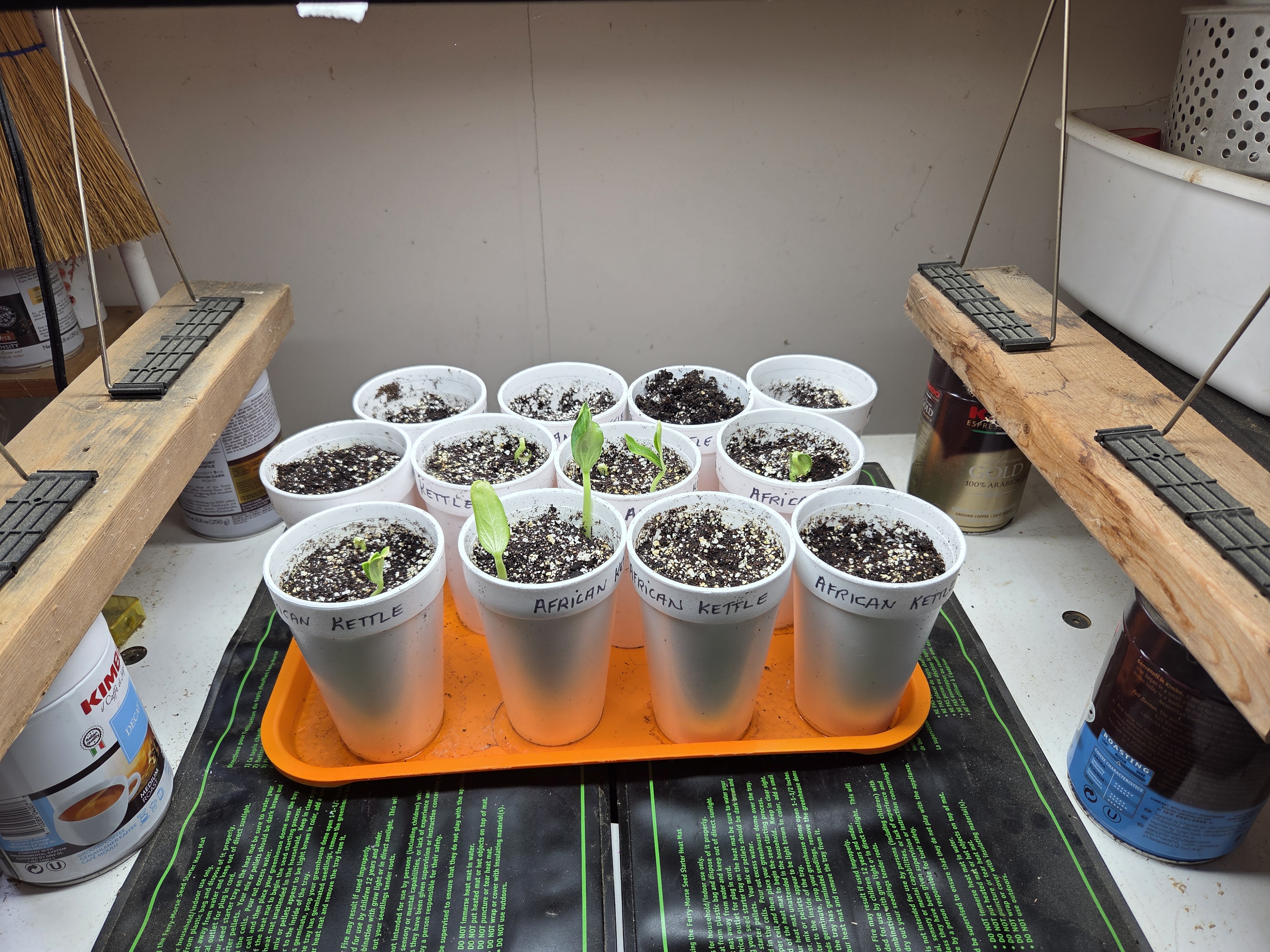 The first of the gourds have sprouted. These are indoor and on a heat mat under grow lights from 7 am to 7 pm.