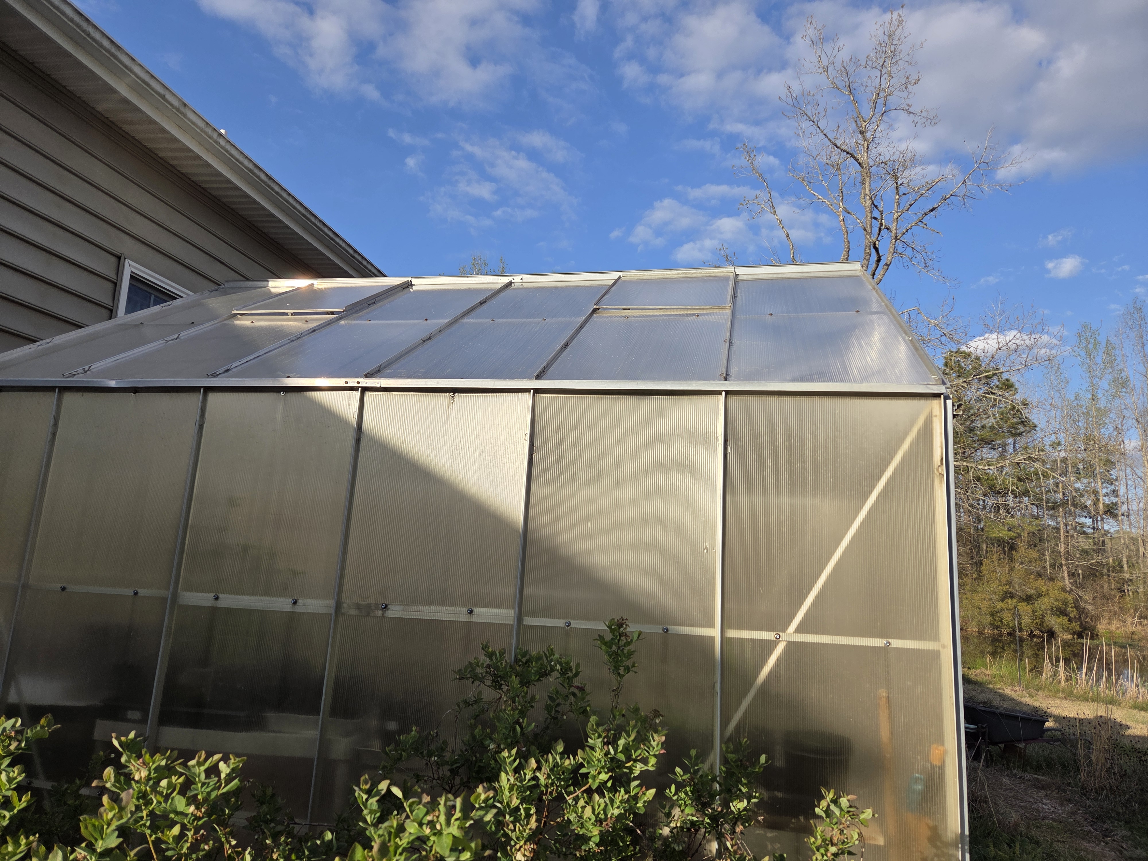 This got new roof panels last week. They are of a corrugated plastic. They last about 6 years and then you have to make new ones. Or buy another greenhouse kit to swipe the panels from. No one sells replacement panels for these. Kits come with cut panels. Replacement material comes in 4x8 foot sheets and you get to cut them yourself. Helps to have a machine shop and a shear.