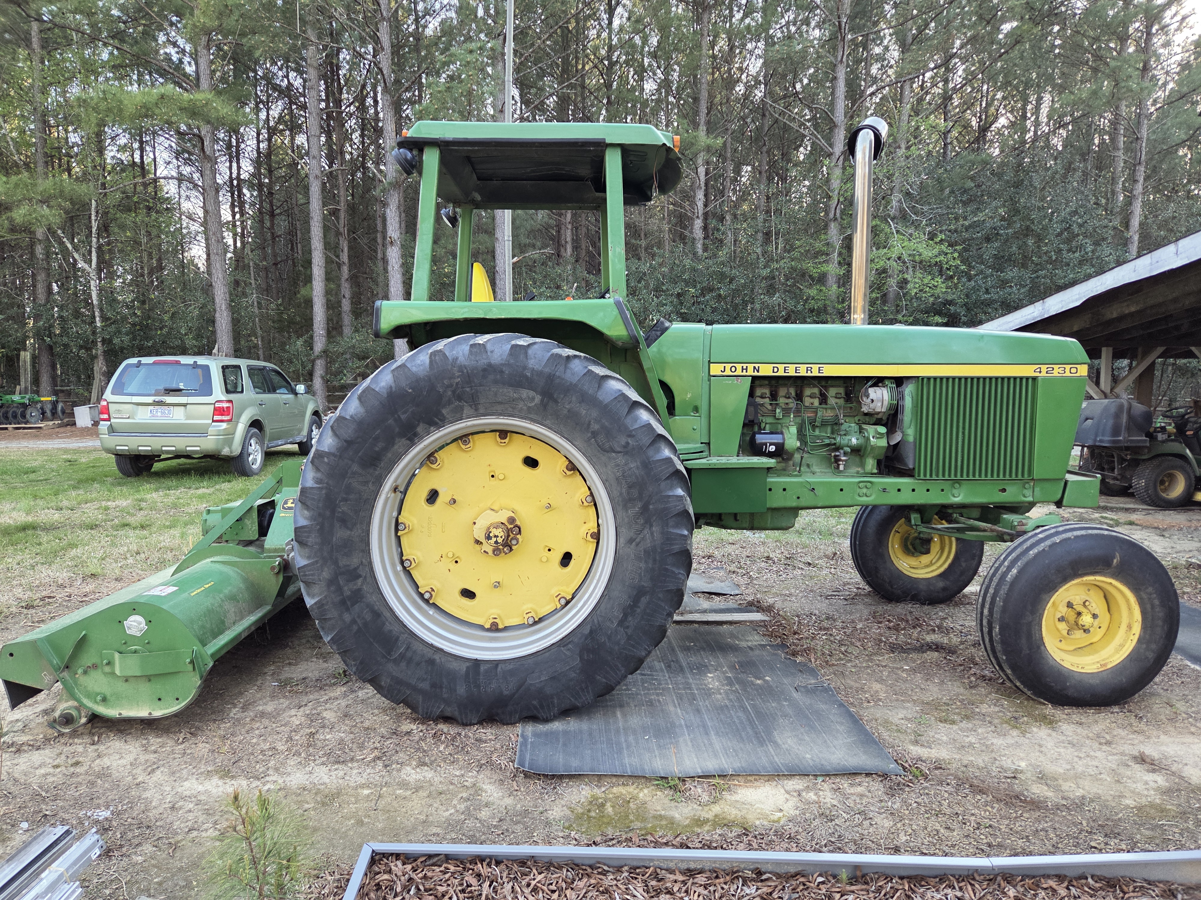 Oh, and today the new-to-me big tractor and my existing 8 foot smooth-cut flail mower got used together for the very first time. I cut the scruffy grass mixed with onions out front. About 4 acres worth. I now have a 110 HP lawn mower with an 8 speed powershfft transmission which can run from 1.5 to 19 MPH. I was mowing from 4 to 6 MPH.