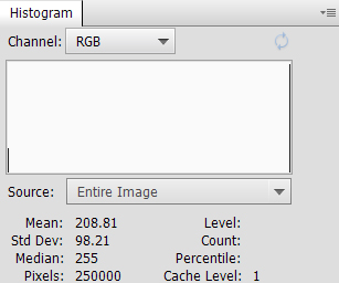 You can see that the only data in the histogram are the two vertical bars at 0 and 255. The height of the bars representing the total number of 0 values in the rgb data and the number of 255 values in the rgb data.
