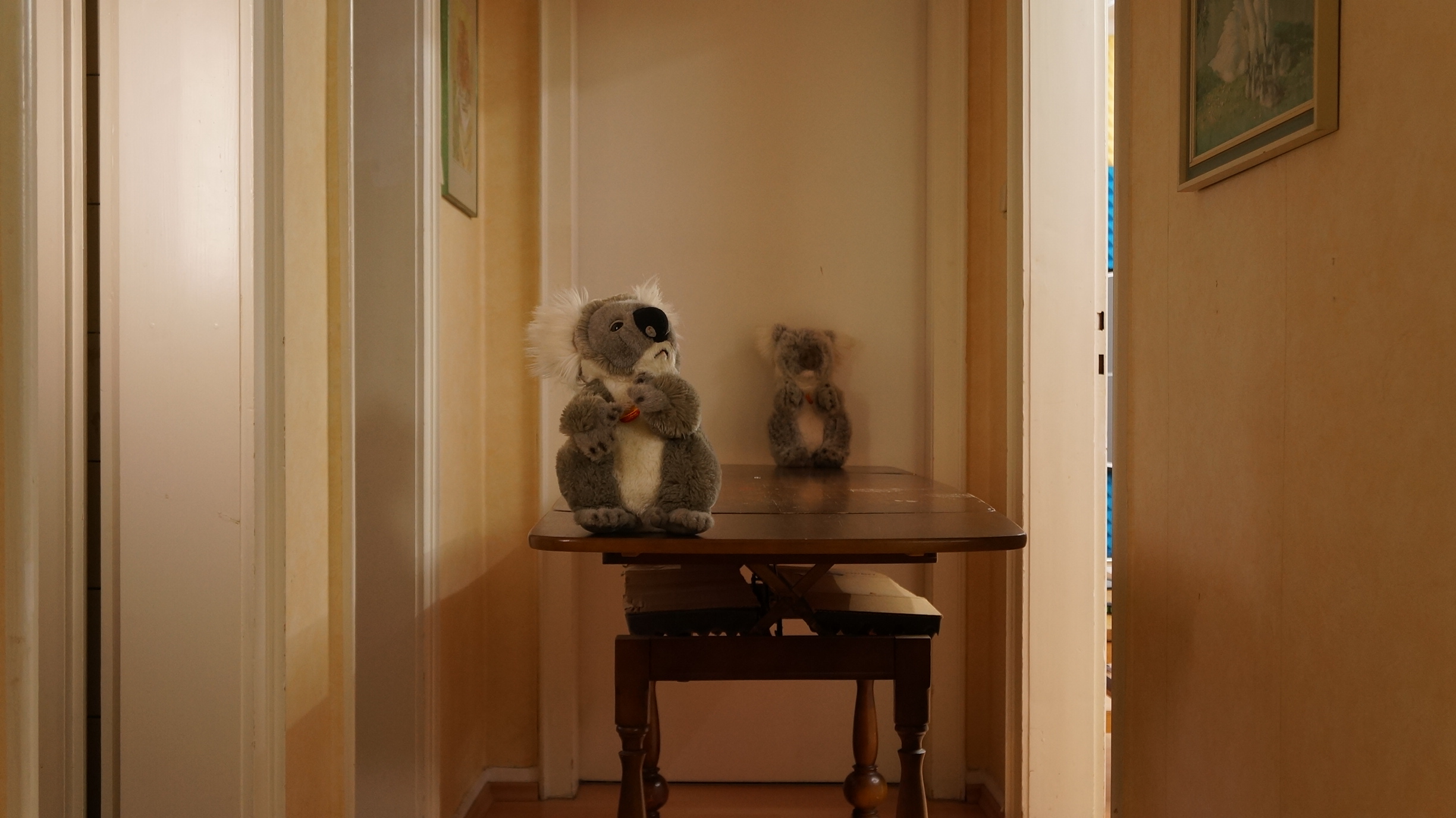 Imagine you are in that scene, sitting in front of the table at the same position where the camera stood and looking at the koalas: