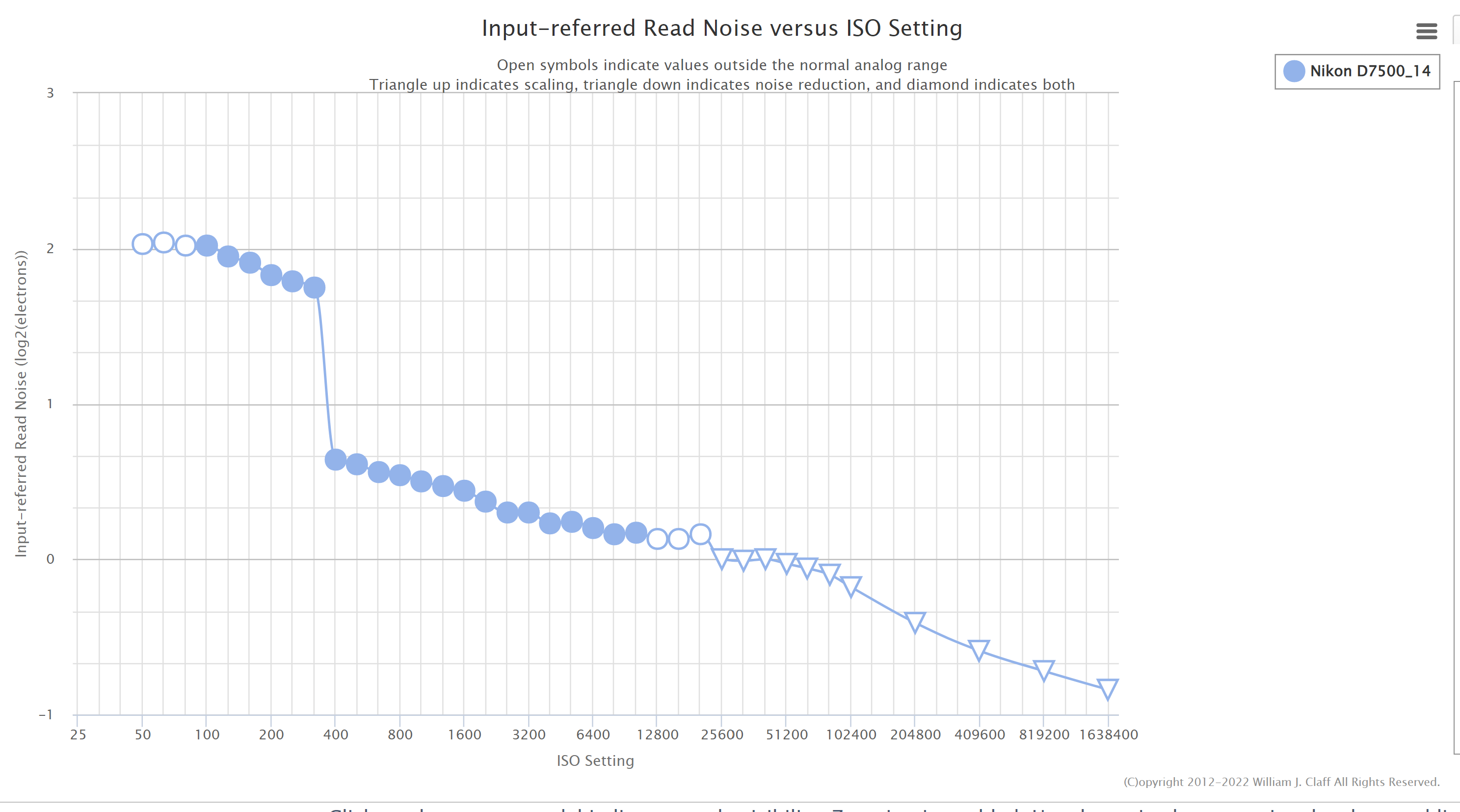 The D7500 read noise vs ISO curve nearly monotonically decreases. There is never a point where turning up the ISO causes more noise if exposure is held constant.