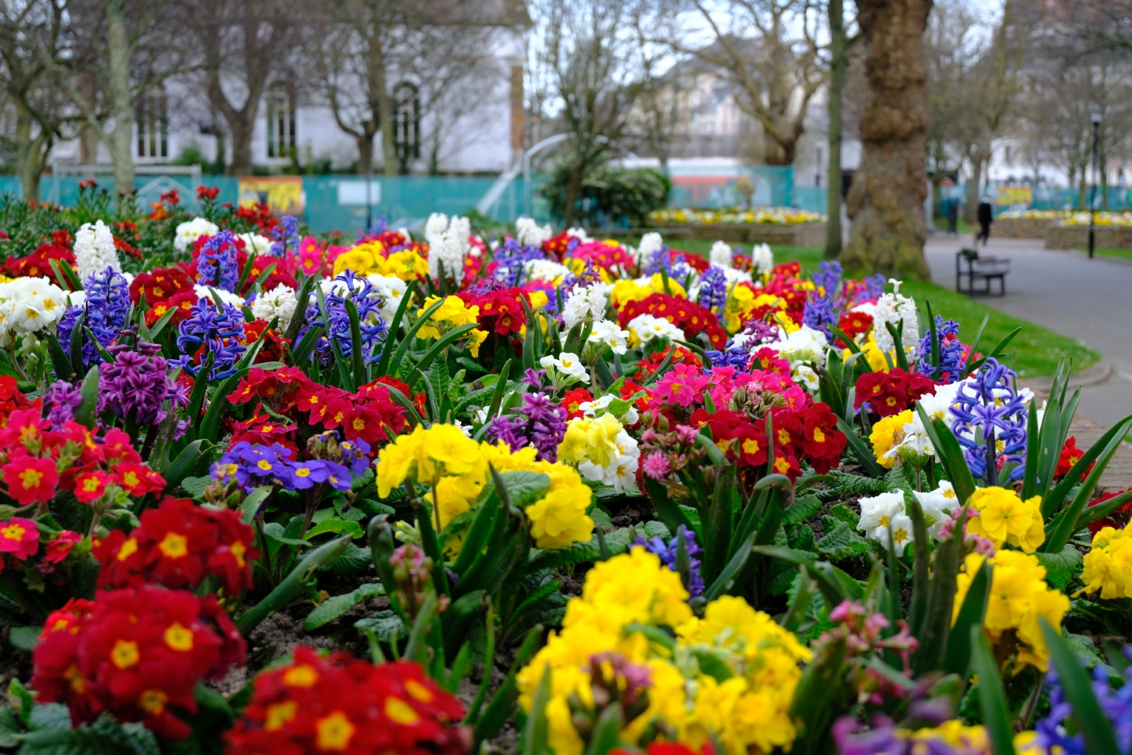 Your first picture is very good. It's been divided into 3 vertically by the two posts (not exactly thirds, but nearly there). Each third has interesting things to see. The fountain base is roughly 1/3 up from the bottom and you have different things above and below it.