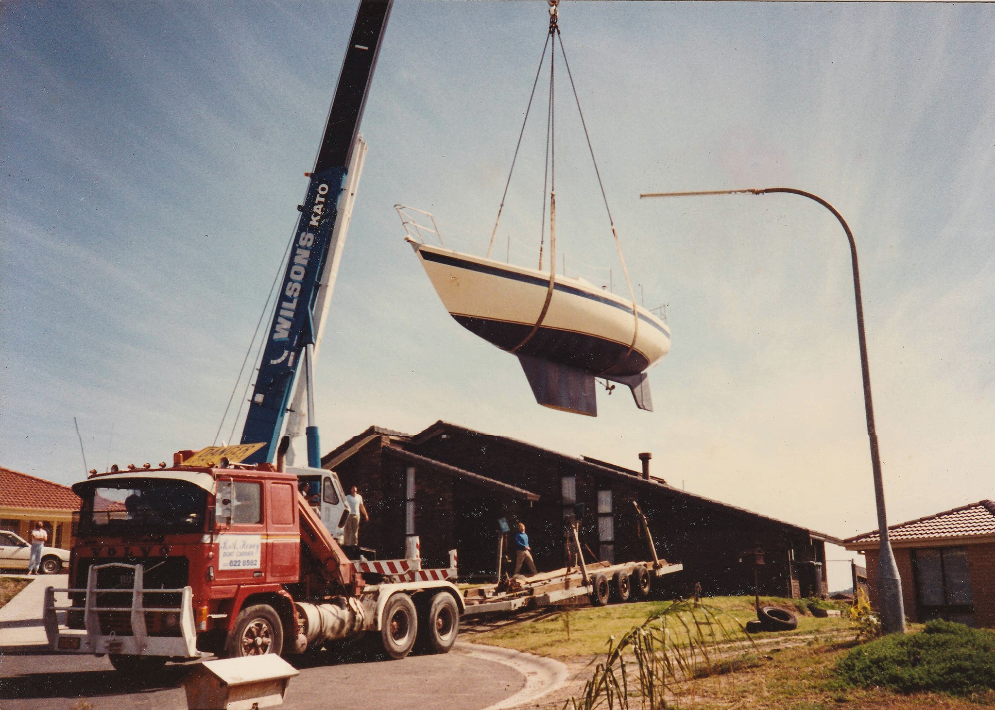 this is my little yacht i built when i was 25 and i built the house its getting lifted over when i was 22. my big yacht i built at 33.