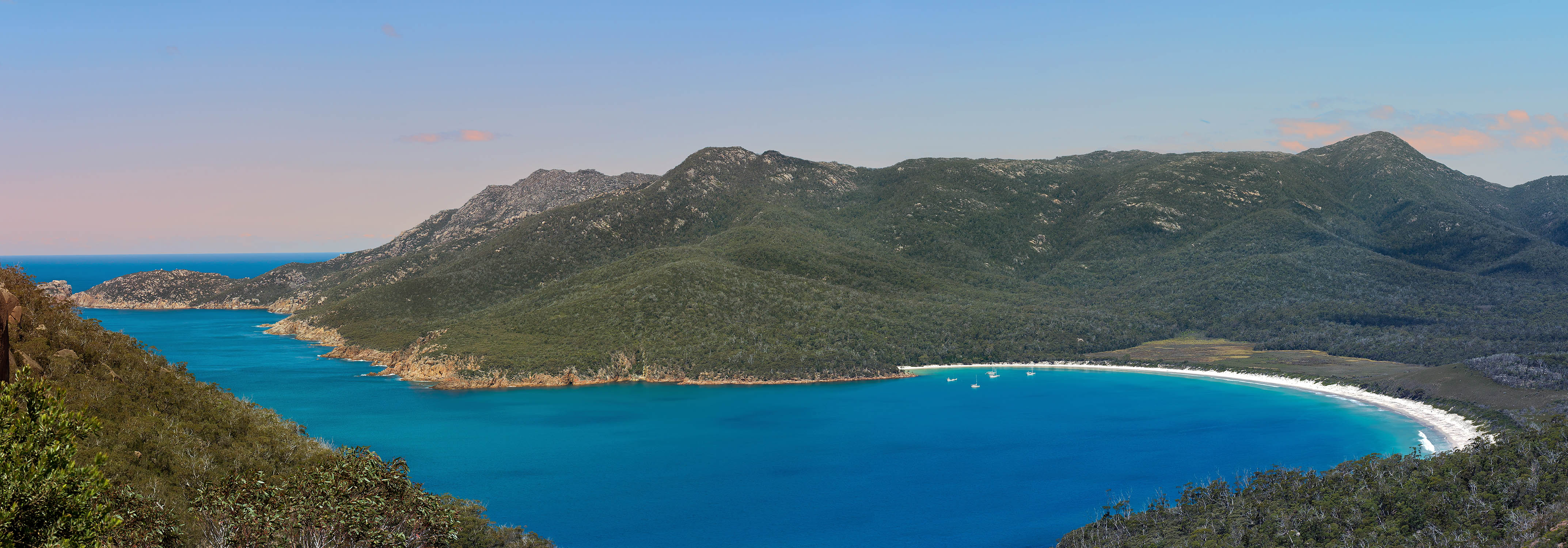 This is a stitched panorama of Wineglass Bay, Tasmania, Australia.