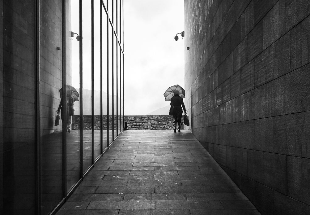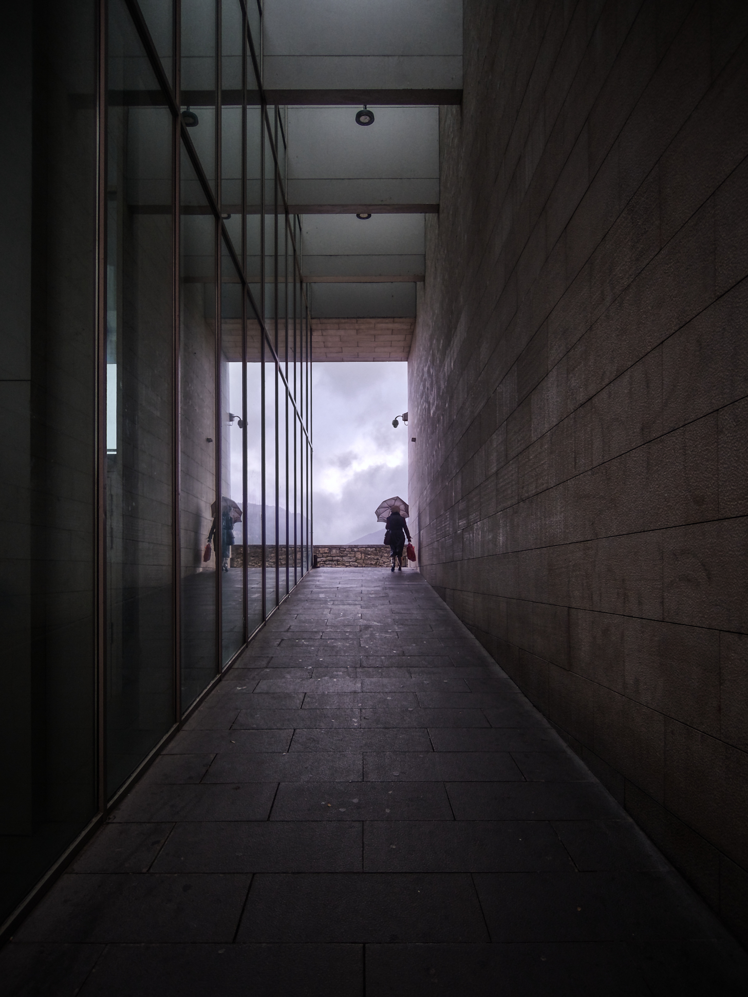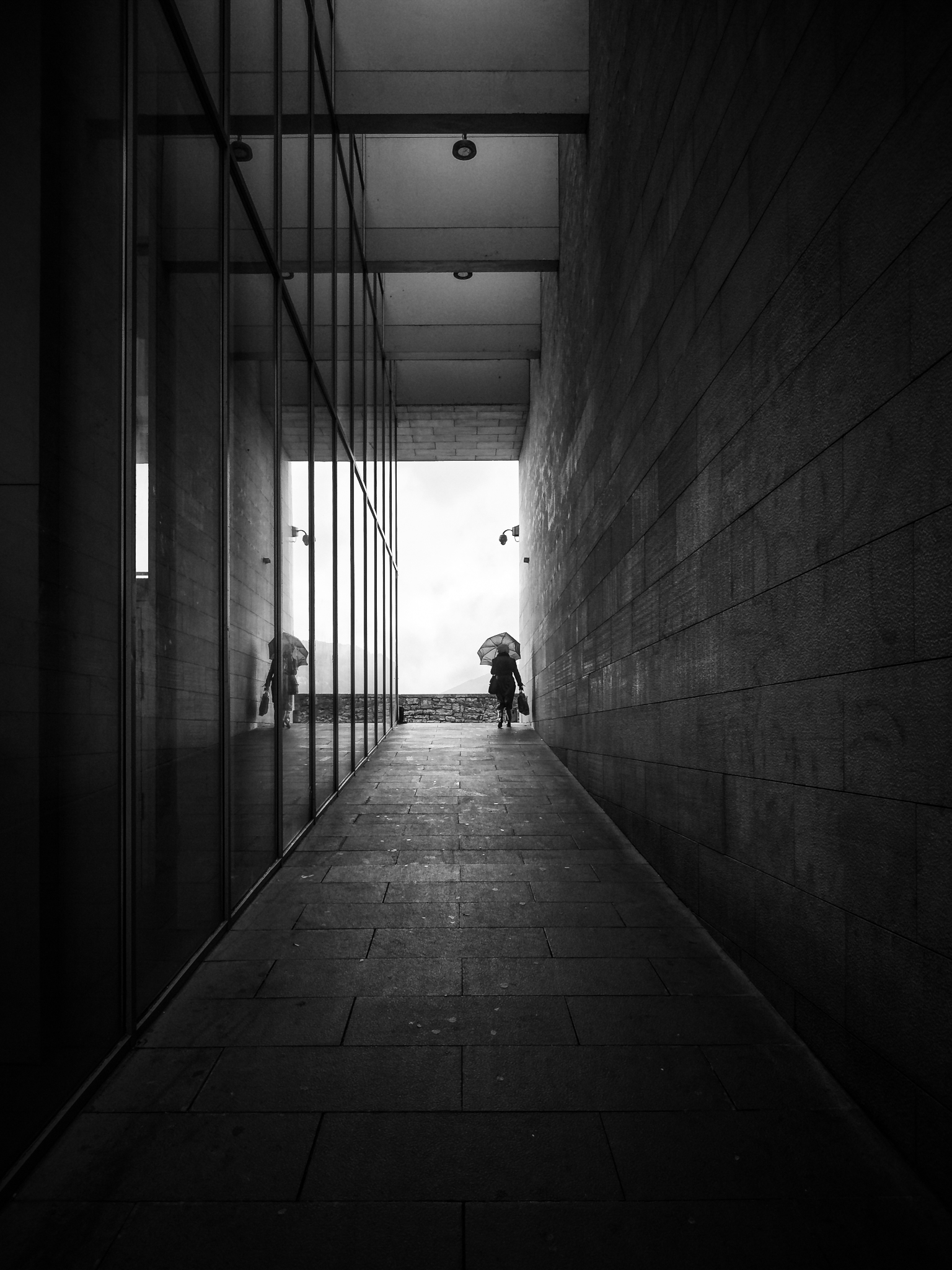 I would have been more radical about overexposure (2 stops or more). As well as reinforcing the guide lines, it also reminds me of the strong light that blinds our vision when we come out of the darkness.