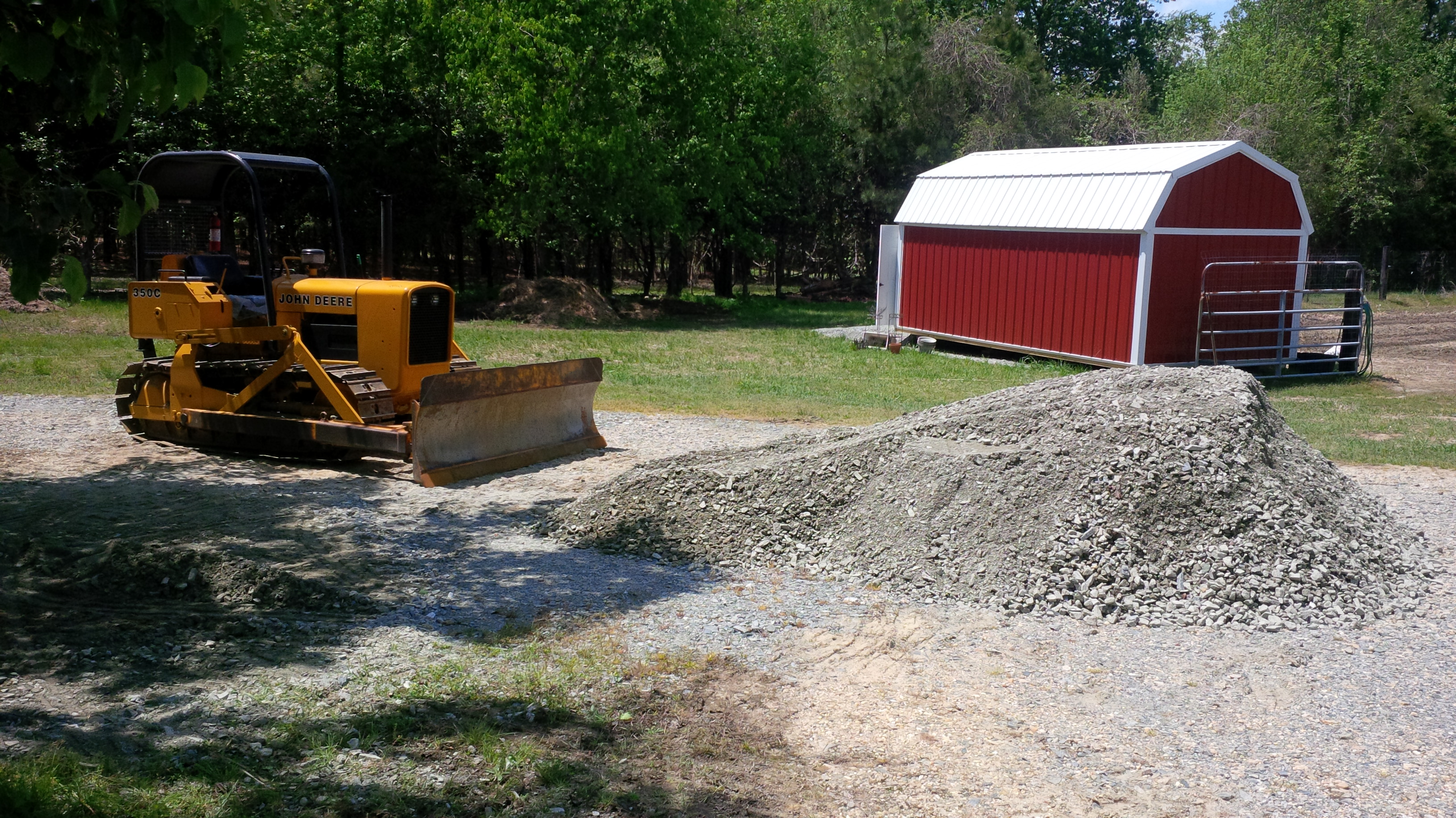 What happened here is a flatbed semi delivered something to the farm using a trailer sans ramps. So, build one out of the farm road repair stone pile. :)