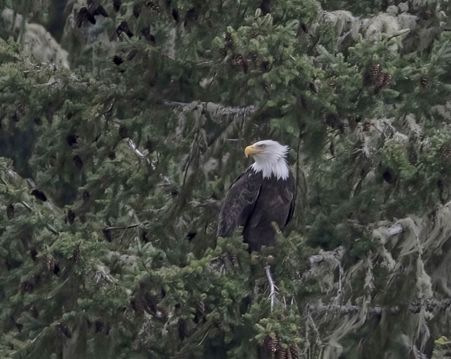 A small reservoir, 1 1/2 mi. from home, has a half dozen Ospreys' almost any day. If you wait awhile, usually a half hour or so, something will happen. Yesterday I hiked down to the waters edge and spied an Eagle in the trees. A small branch was in front of it's face so had to hike a half mile for a different angle. By then the light was fading fast. It was 170 yds. away so the detail isn't the best and I had to crop, even with the 600. But I did like the background.