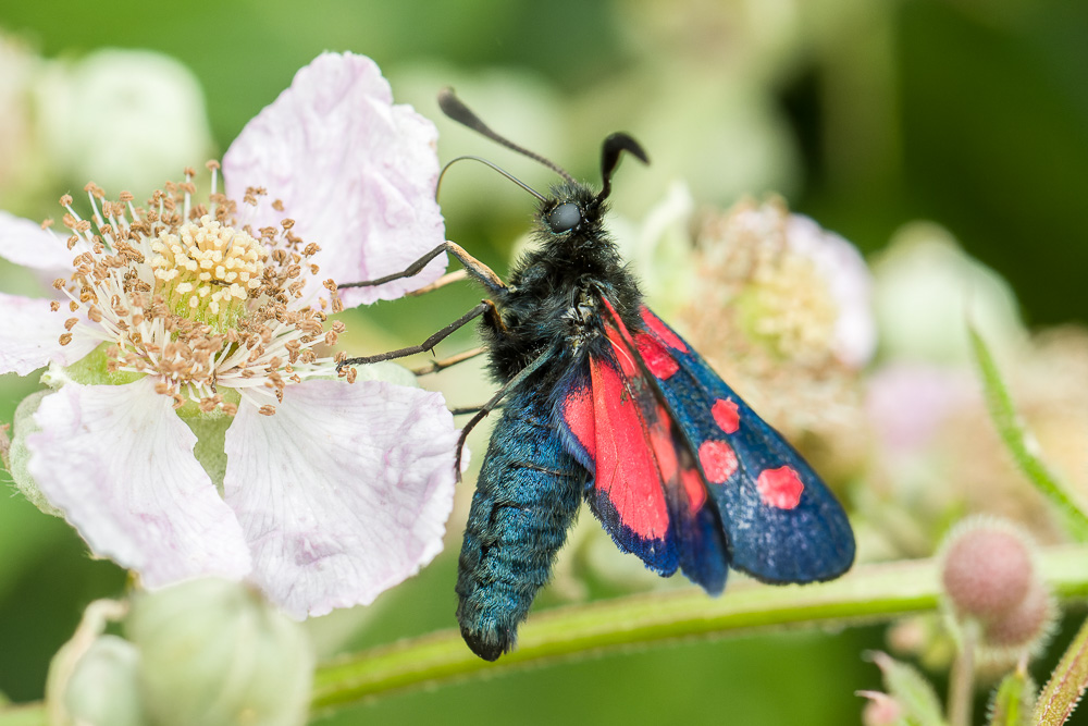 5-Spot Burnet moth. (Aperture f/7.1 <> (SS): 1/500 <> ISO 1250 <> EC: 0 <> PASM Mode: Custom <> Metering: Partial <> Focus Mode: AI Servo <> FL: 90mm <> Lens: Tamron SP 90mm f/2.8 Di VC USD Macro <> Camera ID: Canon EOS 7D Mark II).
