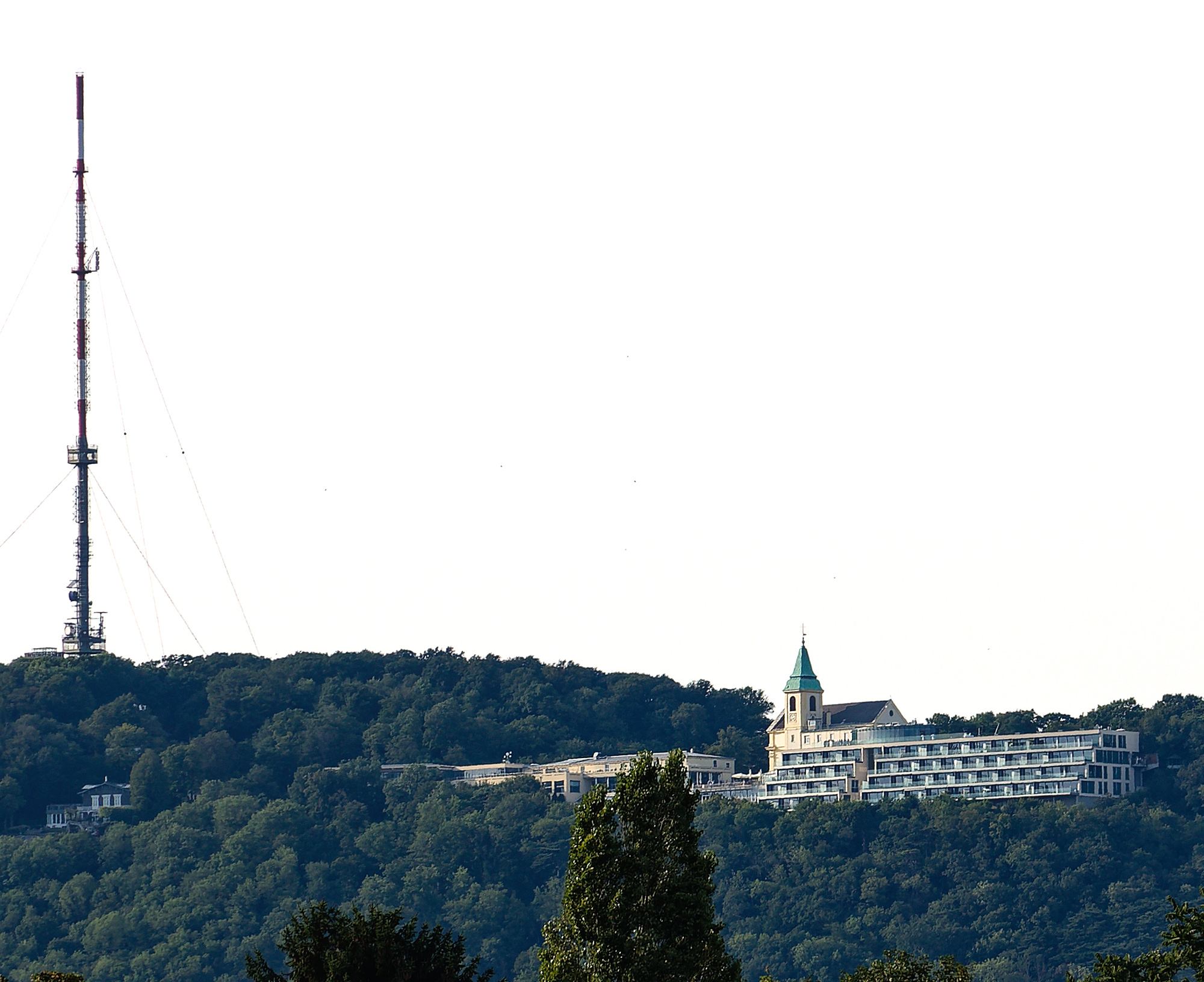 Looking in the other direction, one can see the hotel on the Kahlenberg, the highest local point, which is reached by means of a largely cobblestone road built in the 1930s, with many hairpin bends. From the hotel, it is possible to see the city and the Danube River. However, I do not yet have a good enough shot of that: every time I visit with that in mind, the view is not clear enough. I think the transmitting tower is used for tv and cellular signals.