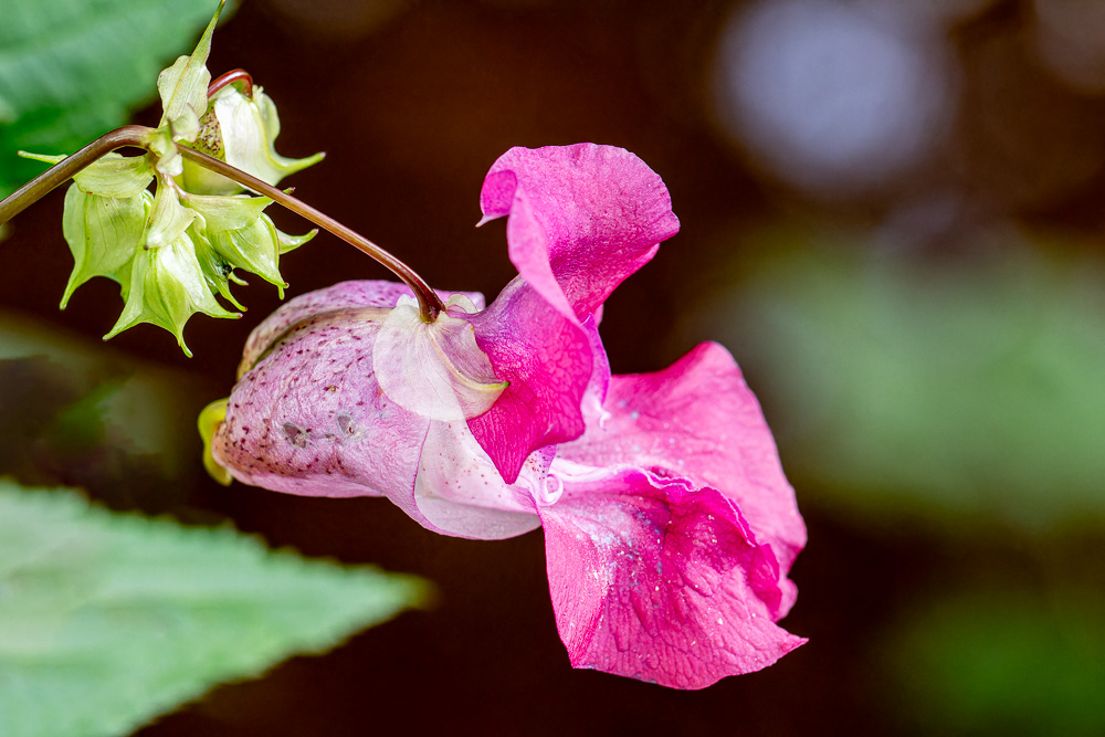 Himalayan balsam, a strange looking plant. It's considered an invasive non-native plant. Each plant can produce up to 800 seeds, the seedpod can propel the seeds upto 7 mtrs. So they spread very fast. (Aperture f/7.1 <> (SS): 1/160 <> ISO 2000 <> EC: 0 <> PASM Mode: Aperture Priority <> Metering: Evaluative <> Focus Mode: One Shot <> FL: 90mm <> Lens: Tamron SP 90mm f/2.8 Di VC USD Macro <> Camera ID: Canon EOS 70D).