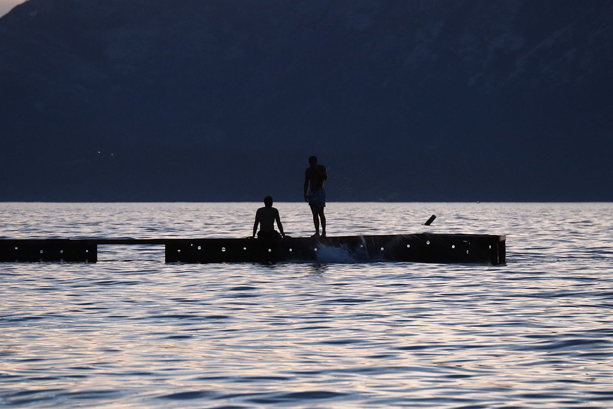 Photo No. 3 - Someone told these young men to come ashore. Just before I could capture this, one of the men jumped into the water. You can see this, if you look carefully for the splash. So I had a three person silhouette change to two people really fast.
