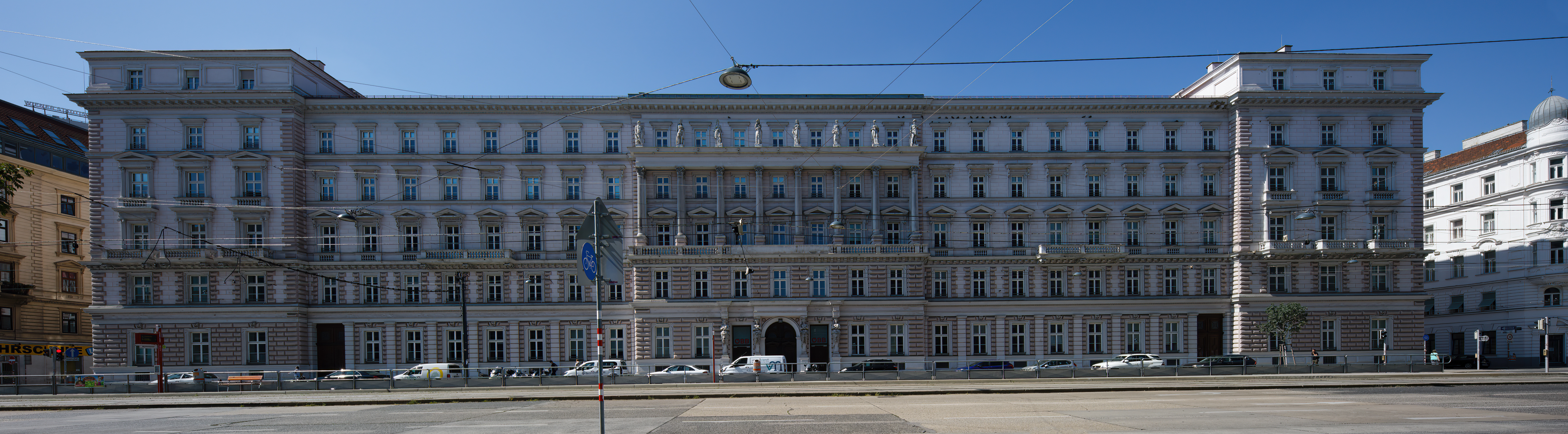Today I spent some time trying to get a better picture of the Hotel Donau. I went out at about noon, which is the only time the sun strikes it, as it is on the east side of a N-S street. What I didnt reckon with was the traffic -- there are stop lights at each end of this 120 metre (c. 394 ft) long building. Whenever there were no vehicles in the shot, people would walk in front of the lens...