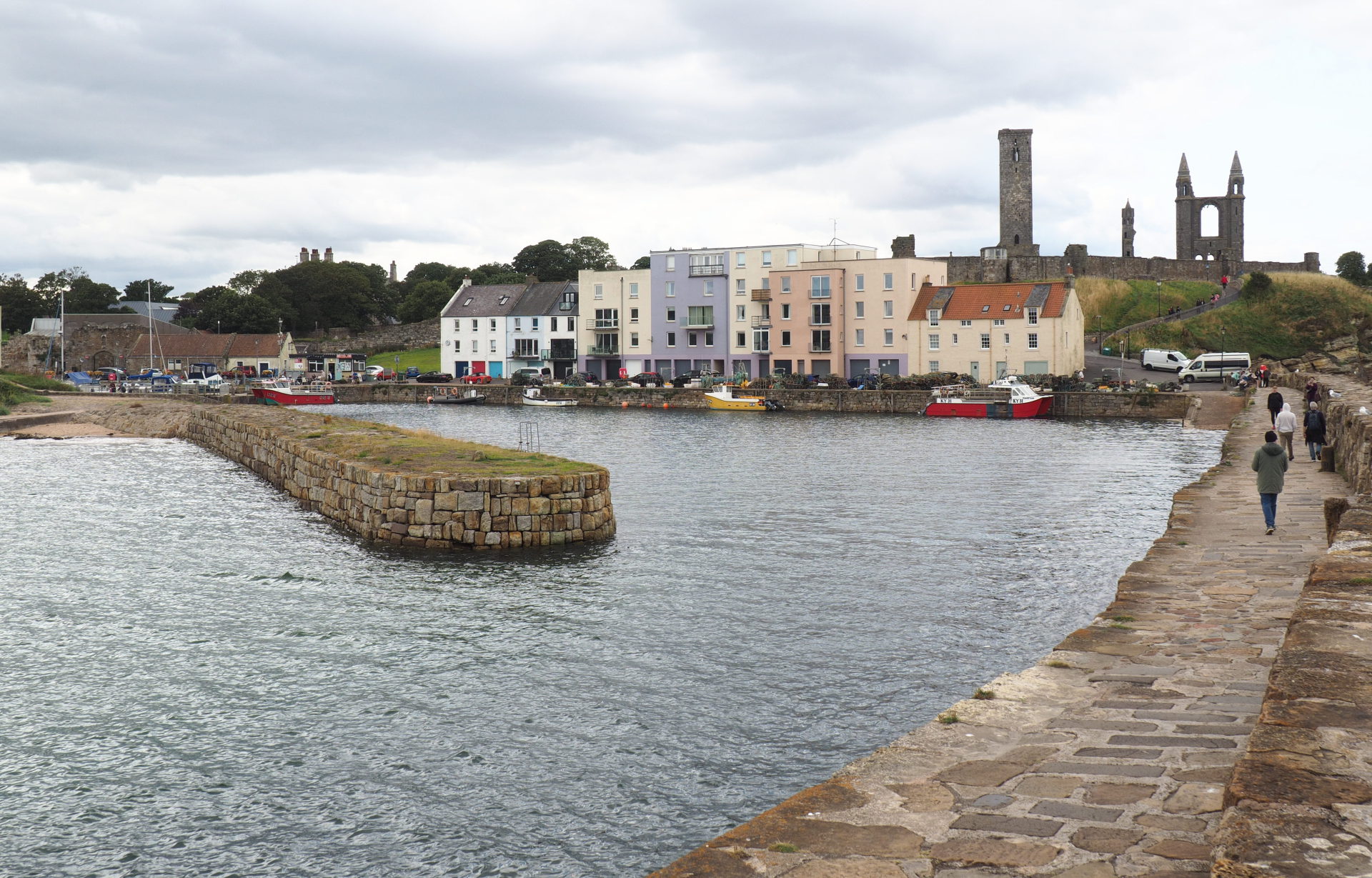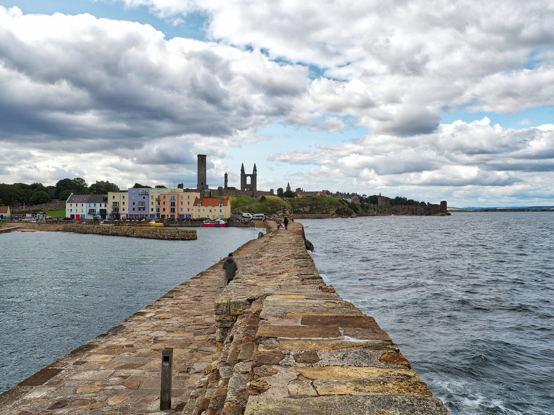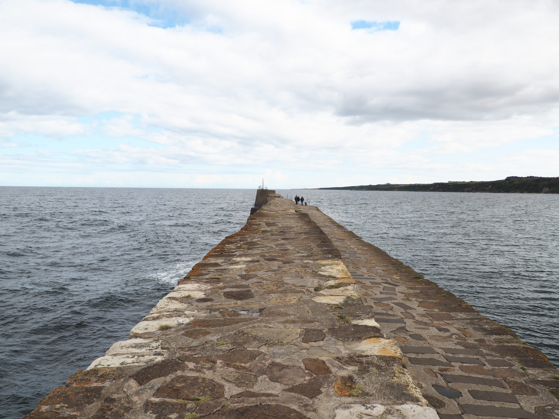 "The early pier was built on the long natural rocky ledge and consisted of double wooden branders fitted to the rocks and inlaid with large boulders. Destroyed by a December storm in 1655, the pier was rebuilt from stone from the ruins of St Andrews Castle.