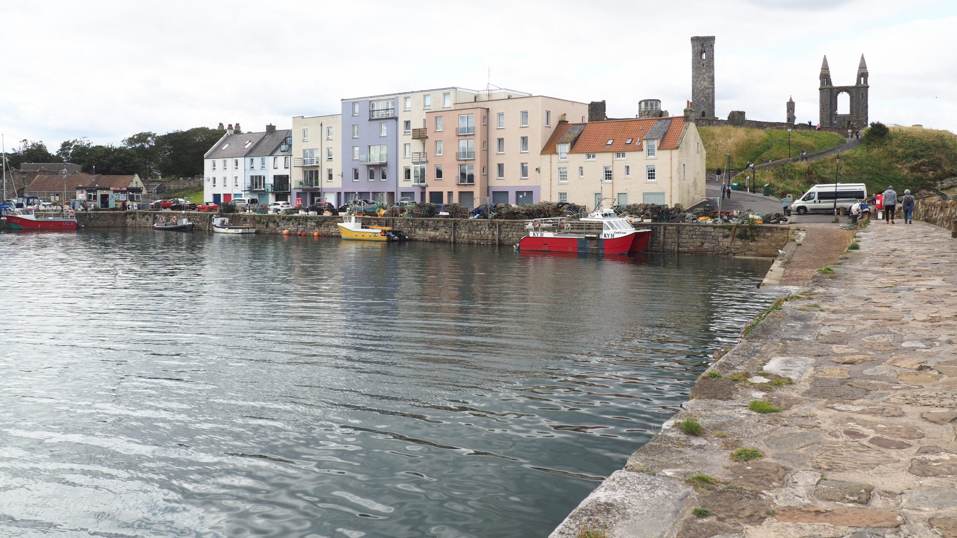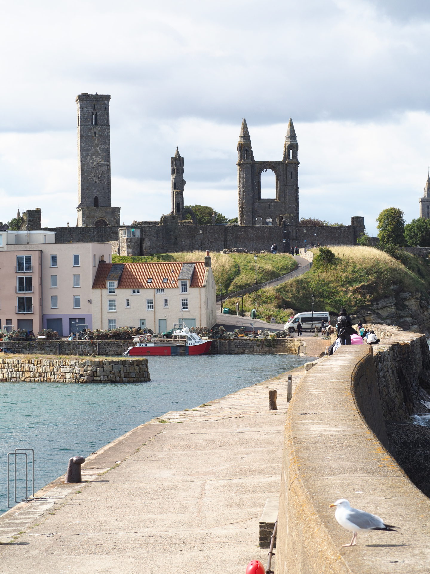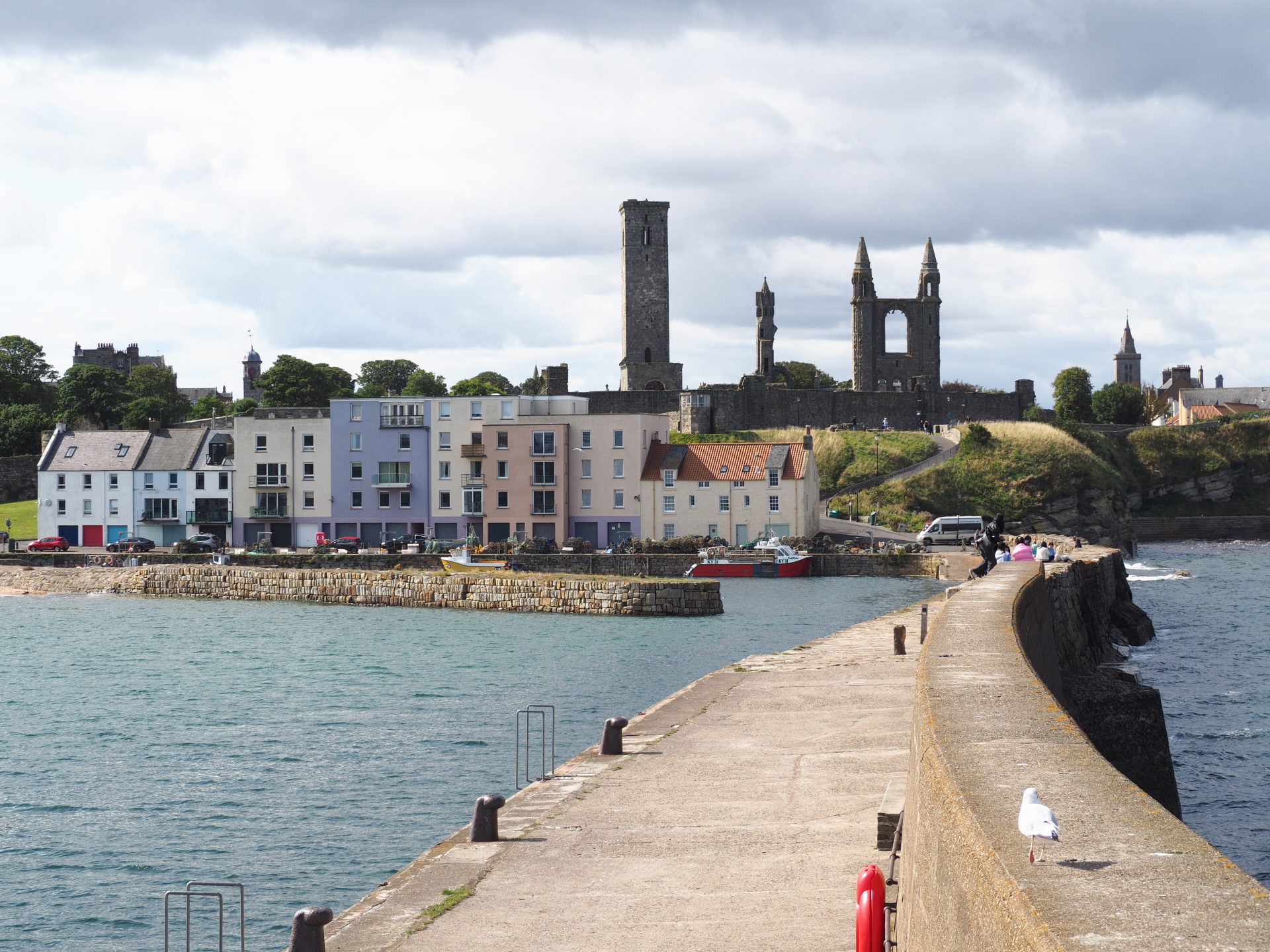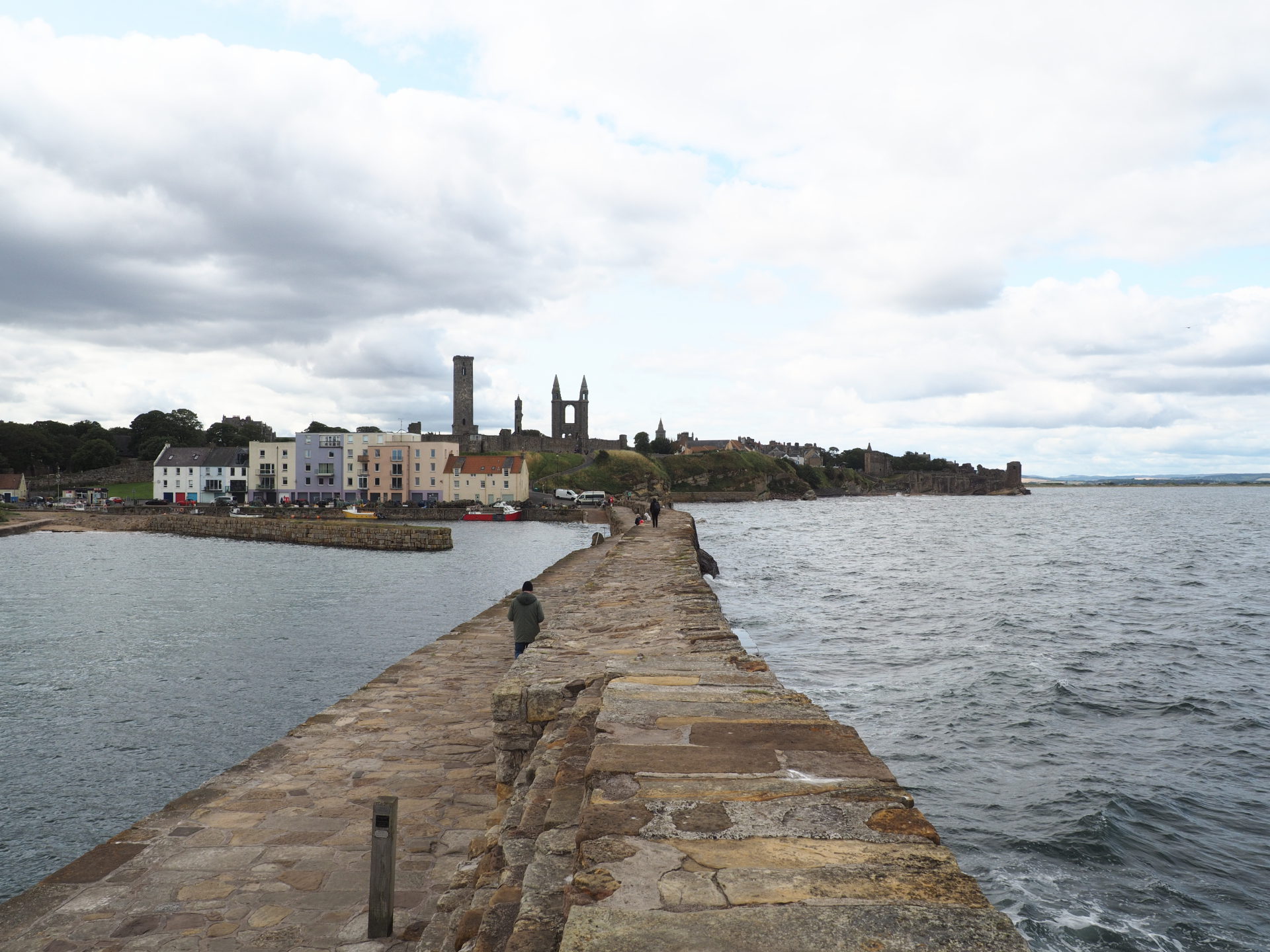 "The early pier was built on the long natural rocky ledge and consisted of double wooden branders fitted to the rocks and inlaid with large boulders. Destroyed by a December storm in 1655, the pier was rebuilt from stone from the ruins of St Andrews Castle.