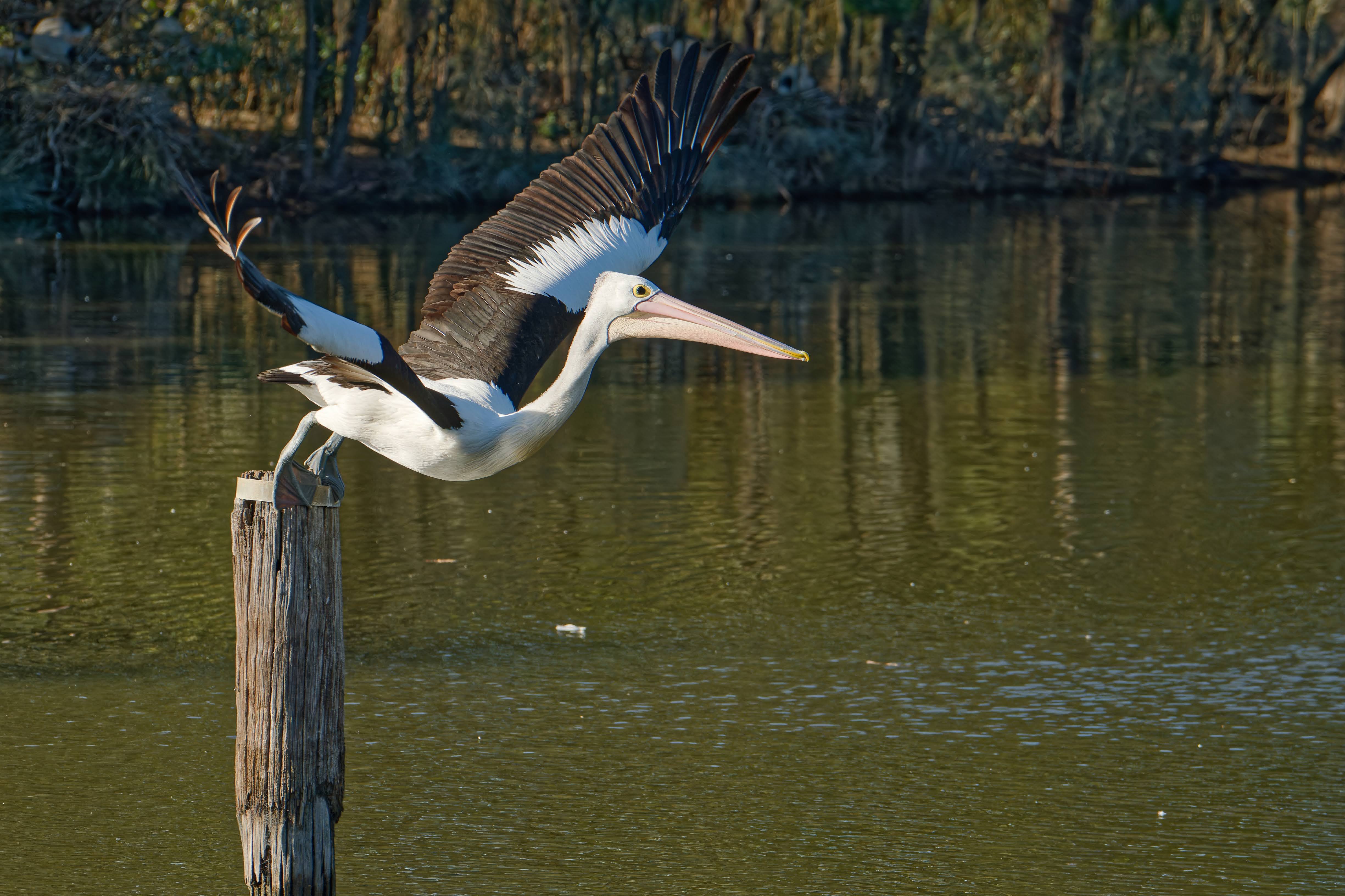 A sequence of an Australian Pelican launching off a post and descending to wet its feet before launching into the air