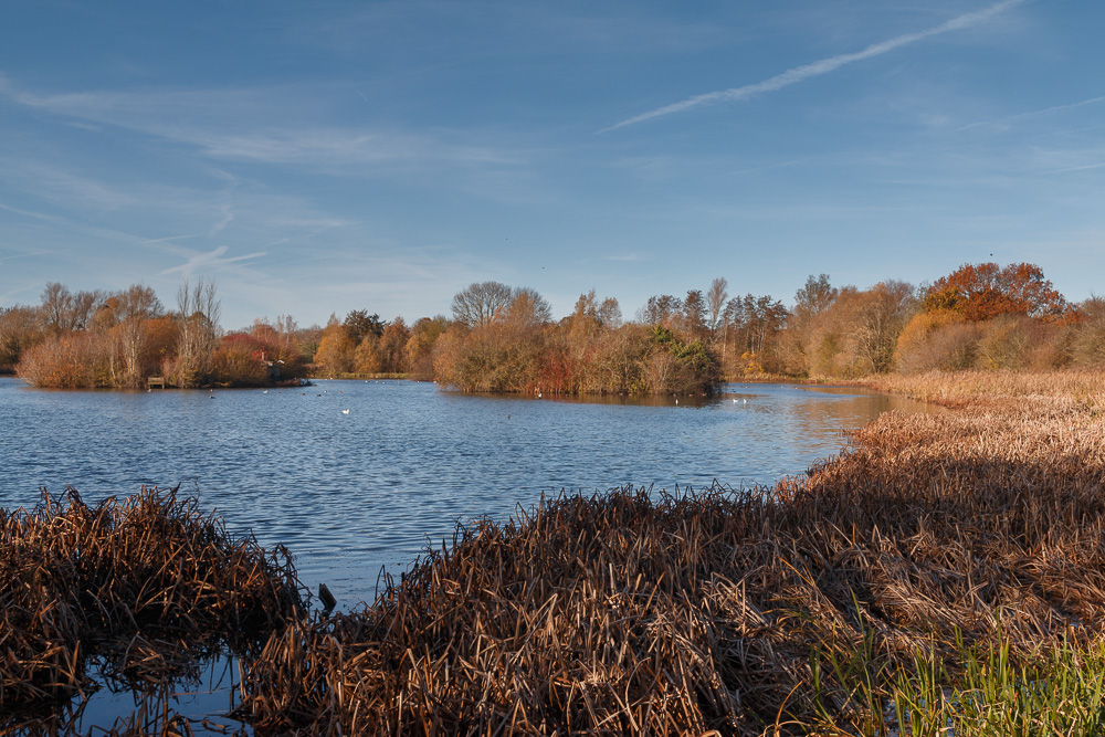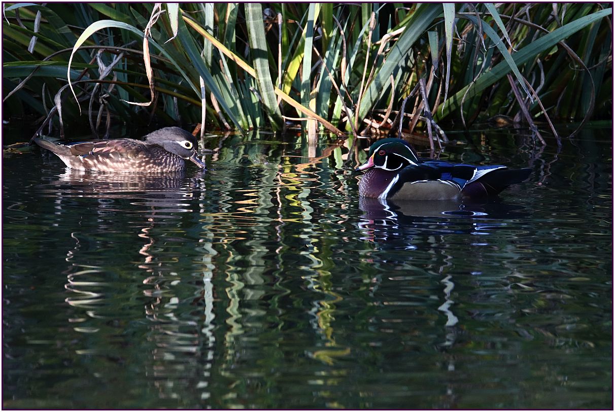 Photo No. 1 - First we see the female and male Wood Duck next the reeds. Because this pond has these reeds, it makes it a popular spot for them. I had a little bit of sun that came through the trees that surround this pond.