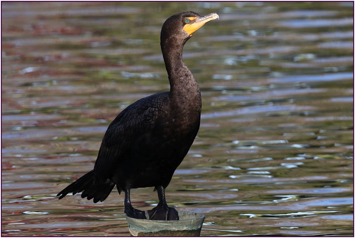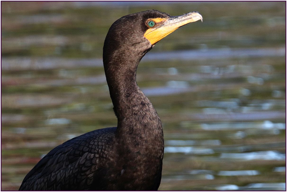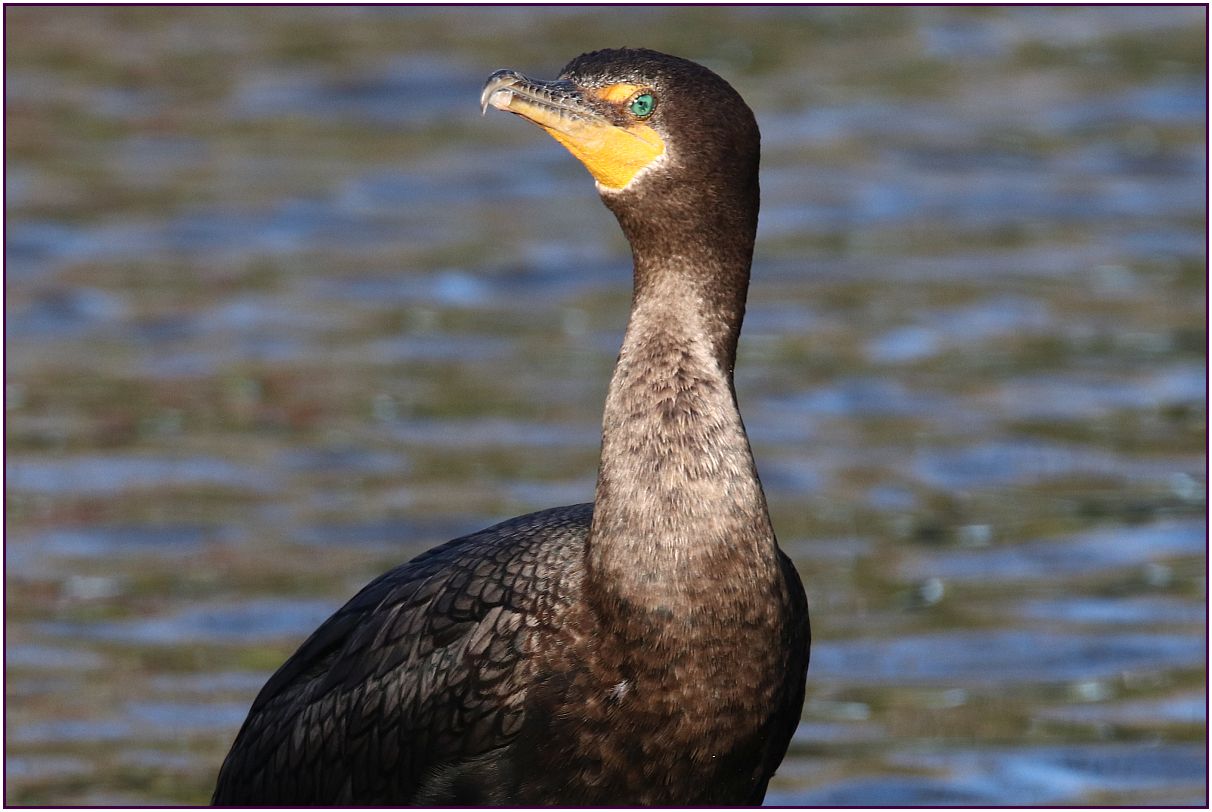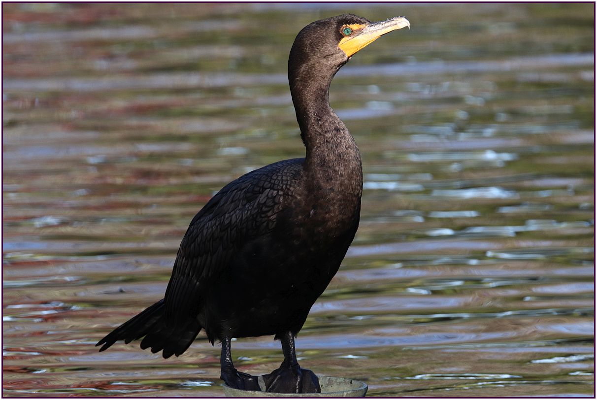 On the day I was looking for wood ducks I spotted this cormorant. The bird was standing on something in the middle of the pond. Since I could not move closer to the cormorant without getting into the water, the last two images were cropped. I just love seeing that blue eye! The sun was just getting ready to set; that's why there is the shadow we see in the lower half of the first two pictures. I lost the sun about ten minutes later, so I was happy that I got these ones.