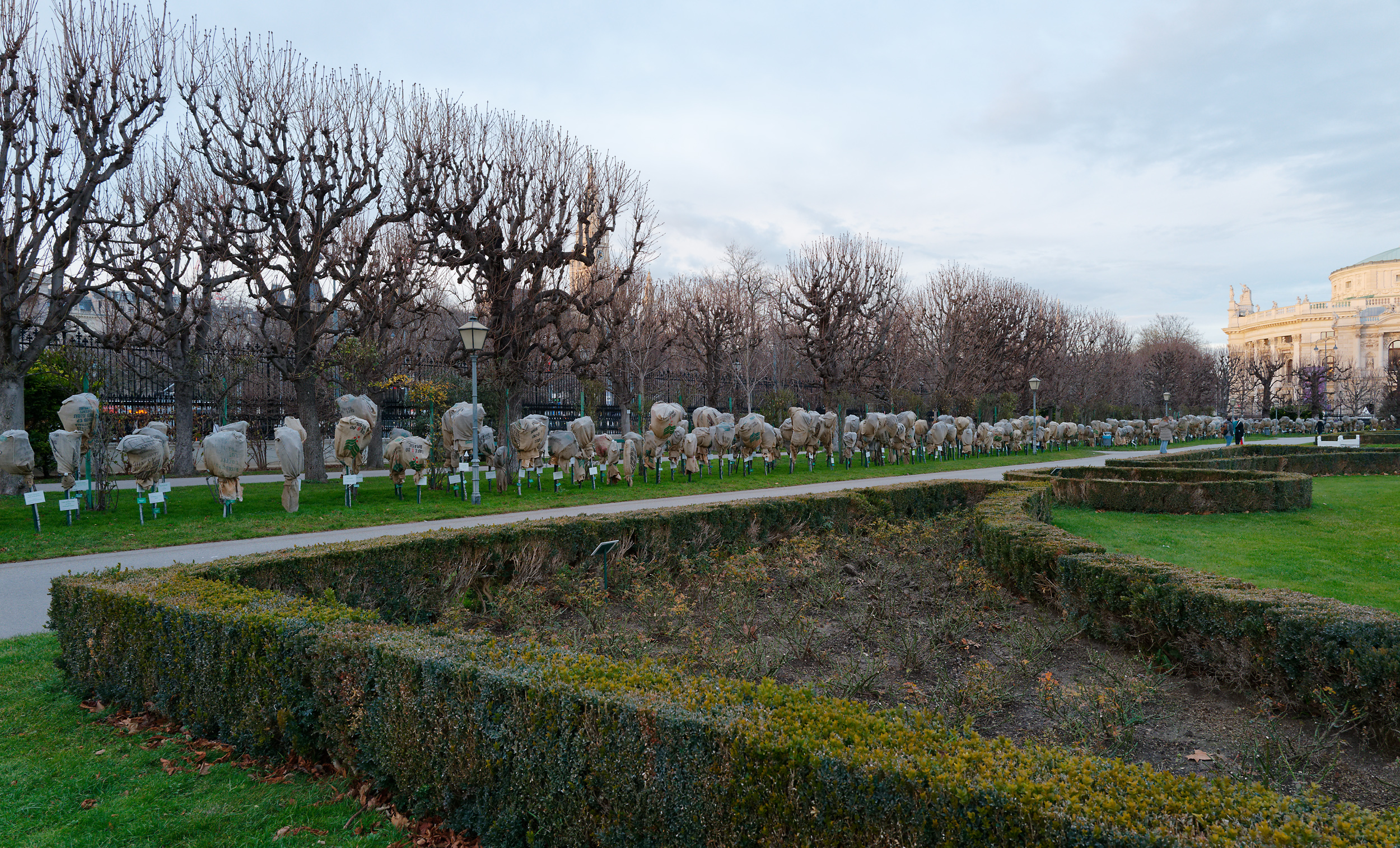 Eventually I reached my destination, which was the Volksgarten, where most the roses that I photographed in June are covered in sackcloth to protect them from any freezing weather. Those in the foreground have been vigorously pruned and are presumably protected from cold winds by the hedge. So far the winter has been mild -- 13°C/55°F today, but January and February are still to come! The trees were cut back quite vigorously last winter and the new growth is evident. One can glimpse the Rathaus through the trees, and part of the Burgtheater on the right.