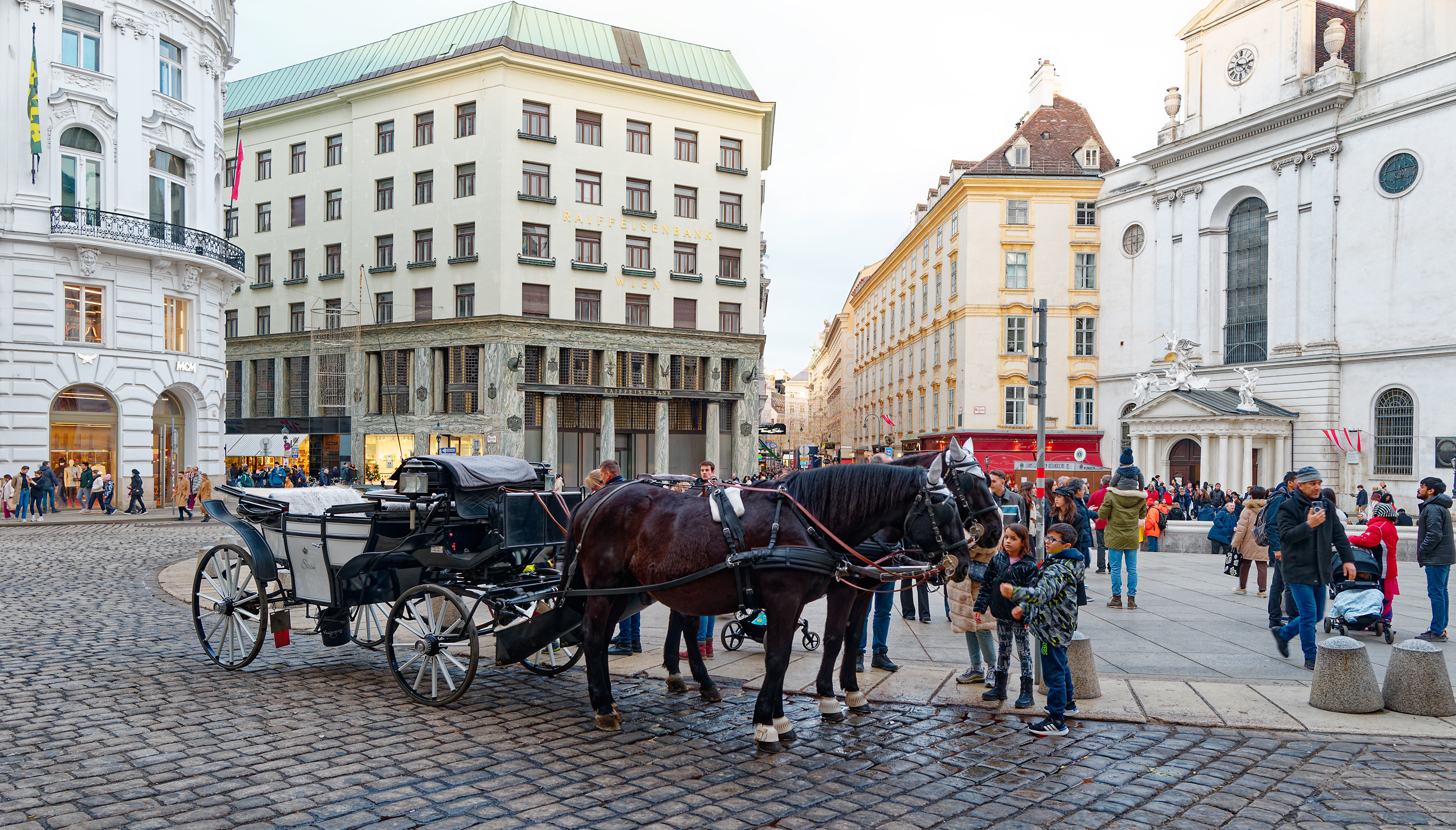 Then I passed through Michaelerplatz (the church may be familiar to you from an earlier photo). This is one of the two places where the horses feed and rest from pulling tourists in their Fiaker during the day.
