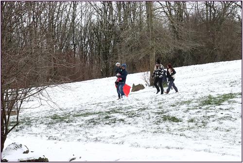 Photo No. 9 - I think these people were looking for other places to slide down the hill. Later after the snow melted, the bench behind them was all covered with water.
