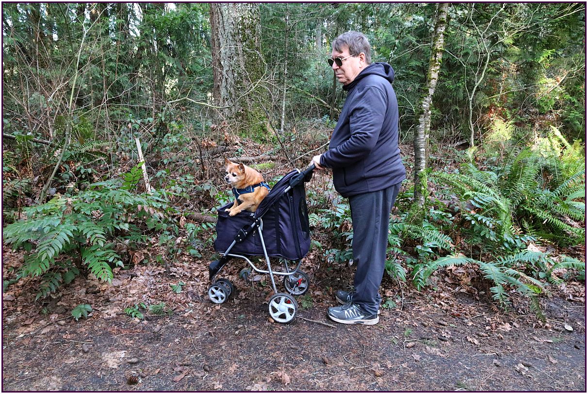 I think the dog went through a number of operations so can't walk much so she uses the stroller to get him out while she at least gets some exercise.