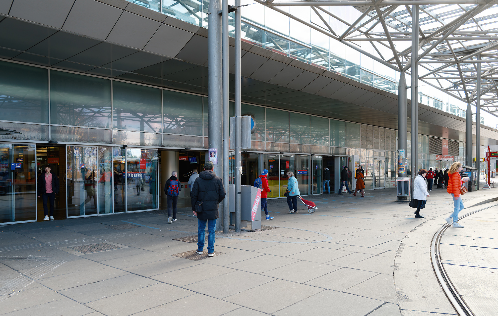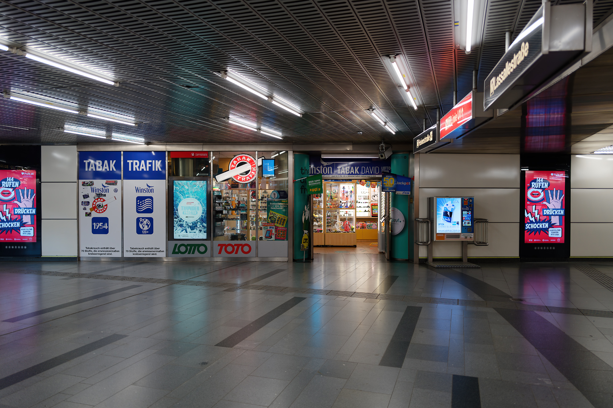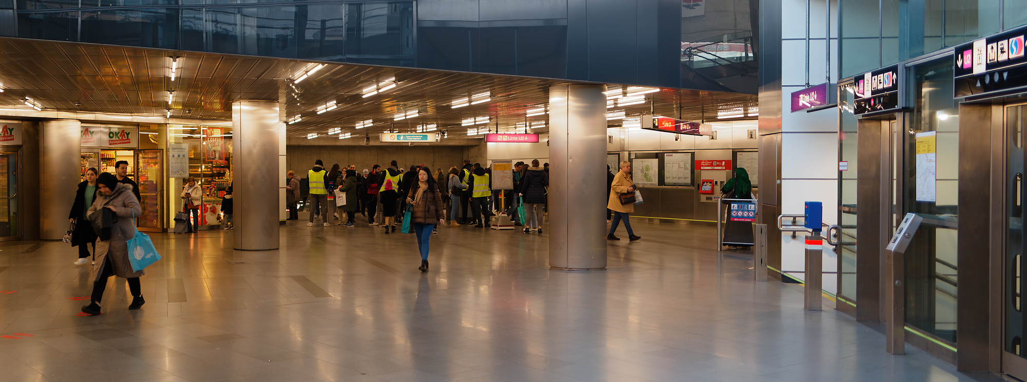 Proceeding further and down a level, by elevator or escalator, there are more shops and in the distance the escalators to the U2 subway platforms. The men with the yellow jackets are inspecting tickets. The whole system is barrier free and inspectors are only rarely seen. Most people have a yearly ticket, as they are reasonably priced and are valid for subway, trams, and buses in the whole of the city.