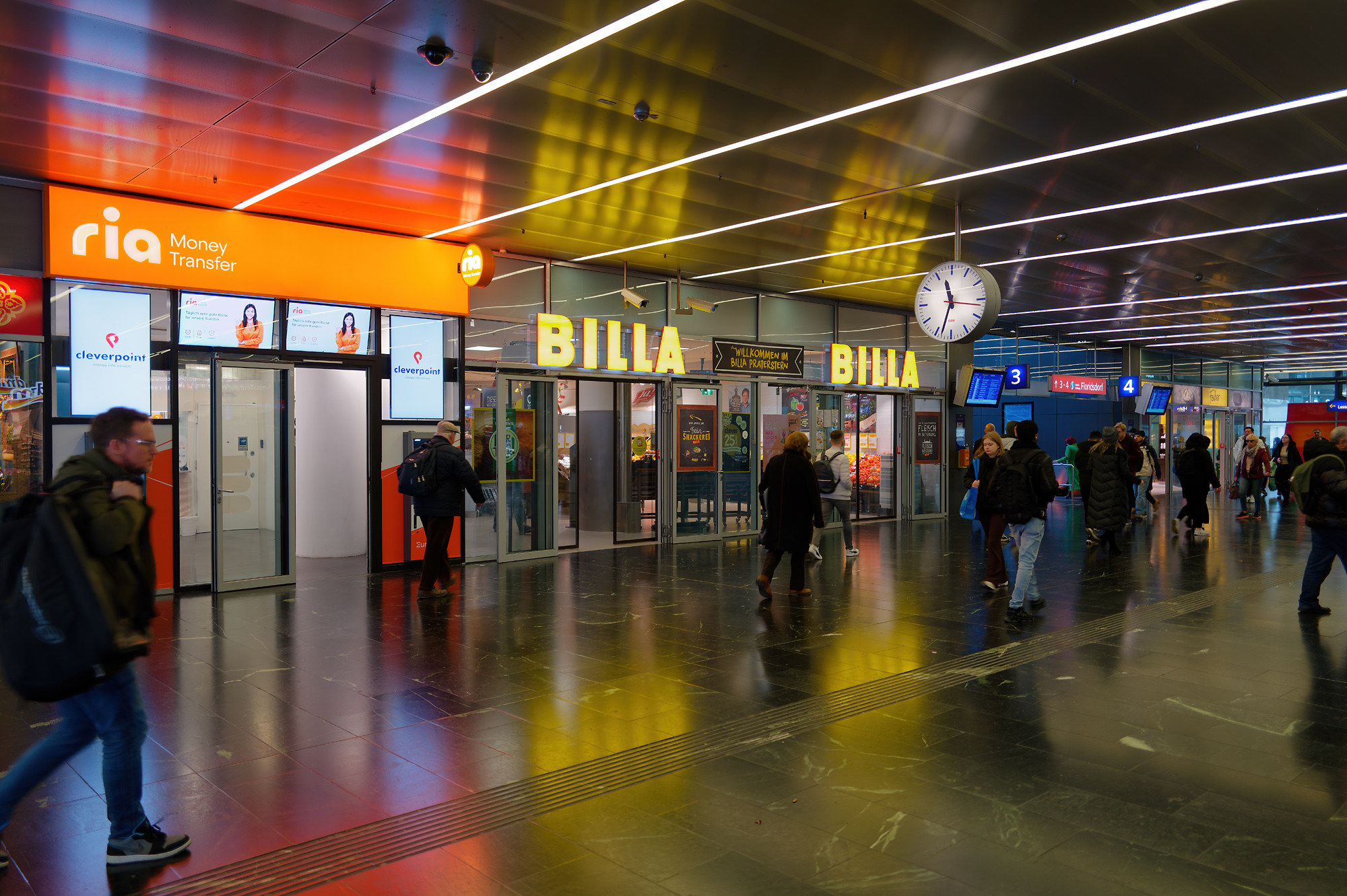 On the left, there is a "money shop" -- which was Western Union up until last week! Billa is a supermarket selling mainly food and drink (including alcohol). This Billa is one of the few shops in Vienna to open on Sundays. Unseen there are also a bread shop, a florist and a tobacconist.