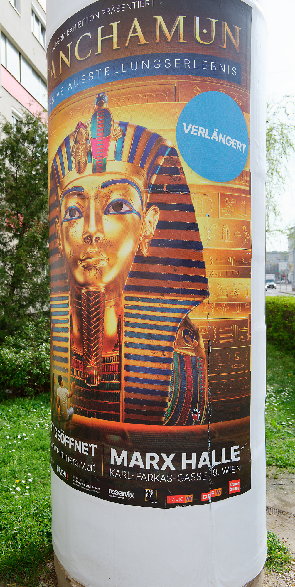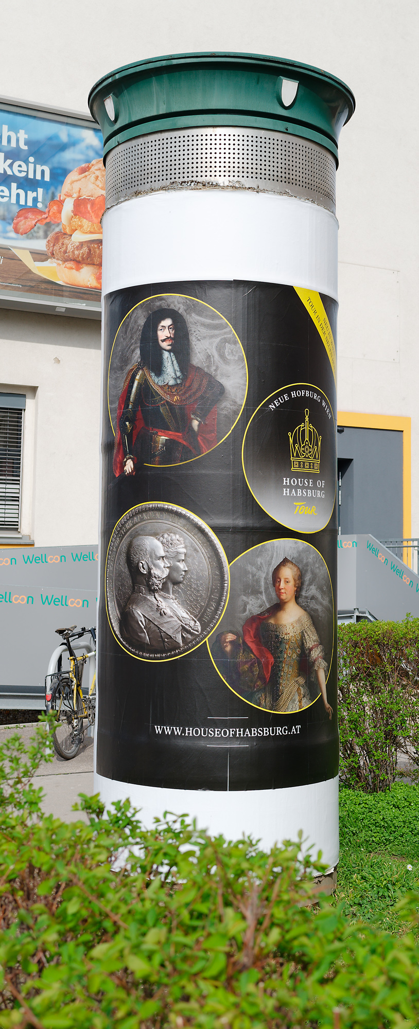 I occurs to me that these cylindrical objects that are used for displaying advertising all over Vienna, Berlin, and other European cities may not be familiar to all of you. They are called Litfaßsäulen after Herr Ernst Litfaß who invented them, and you may have seen them in The Third Man, starring Orson Welles. They also often give access to underground culverts. If you look carefully at the photo of the other side, you can see where the poster has been torn by opening the door that gives access to the ladder that leads down to the culvert.