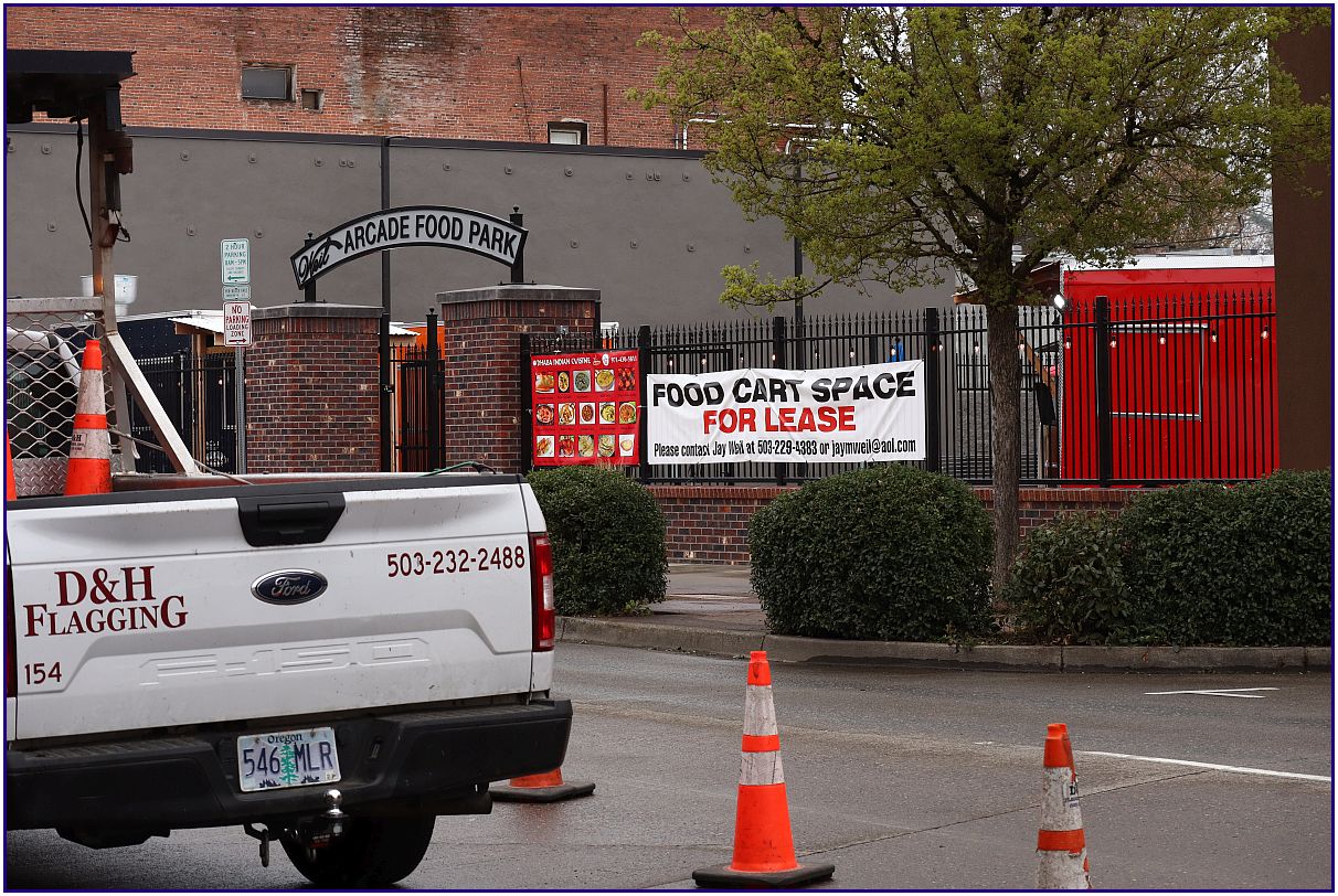 Photo No. 3 - So I walked across the street, to get a peek inside the gate of this food cart space. You can see the bright white food cart space for lease sign on the left side.