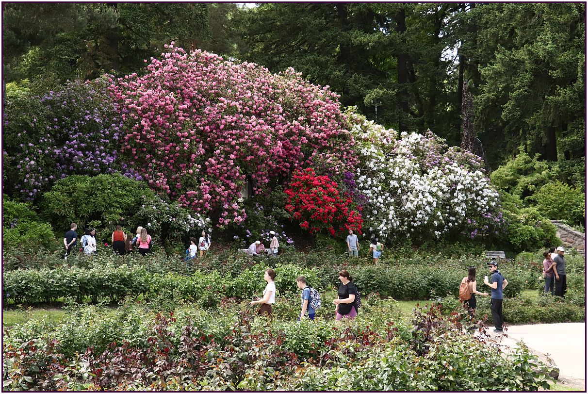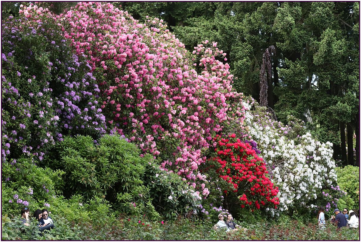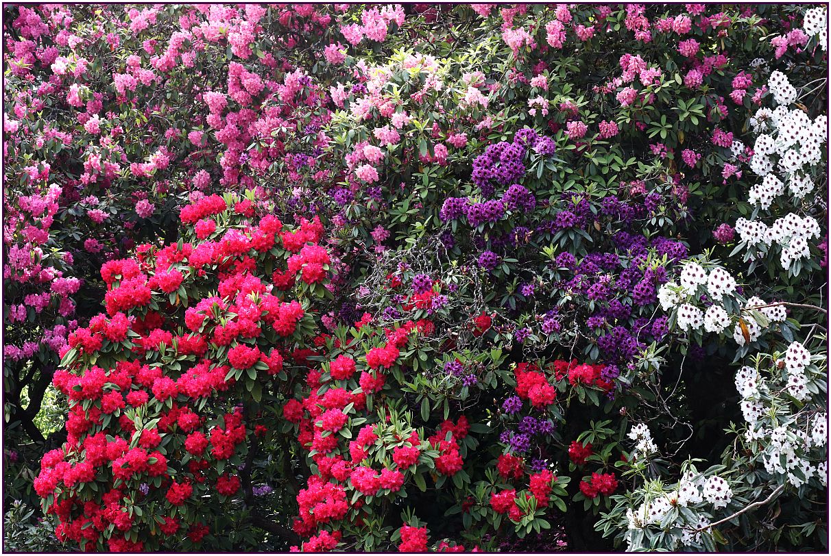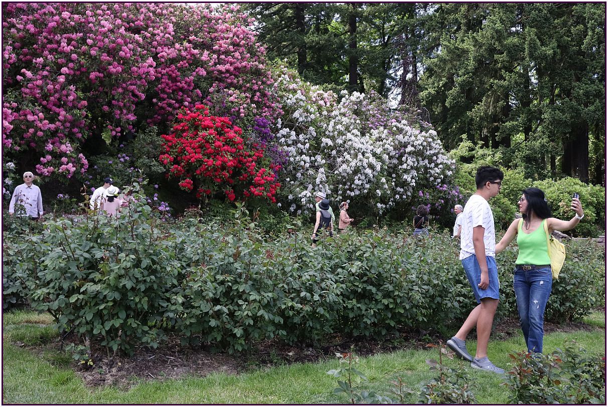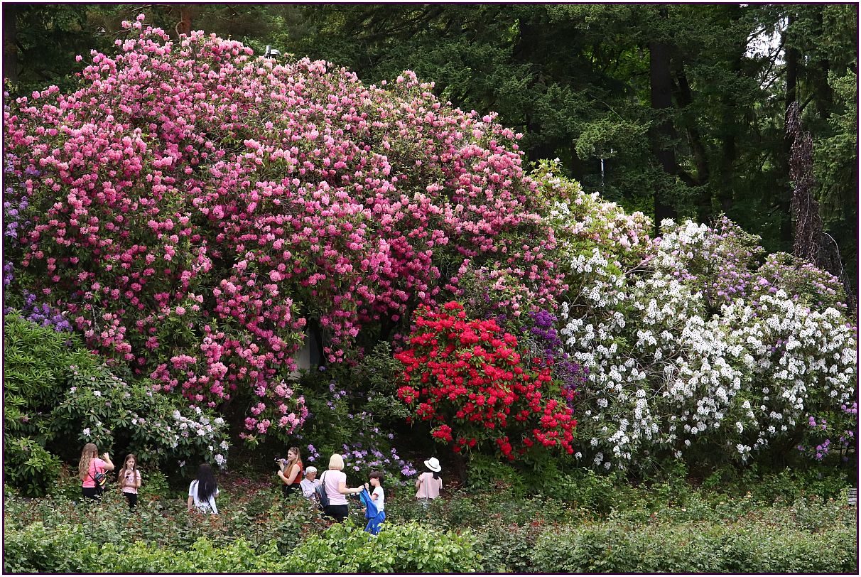 At the end of May I got a chance to see a rhododendron wall at our local rose garden. I caught it at its peak or nearly so. I brought with me four cameras and four lenses, just so I could play around with them. Two cameras and lenses would have been fine otherwise.