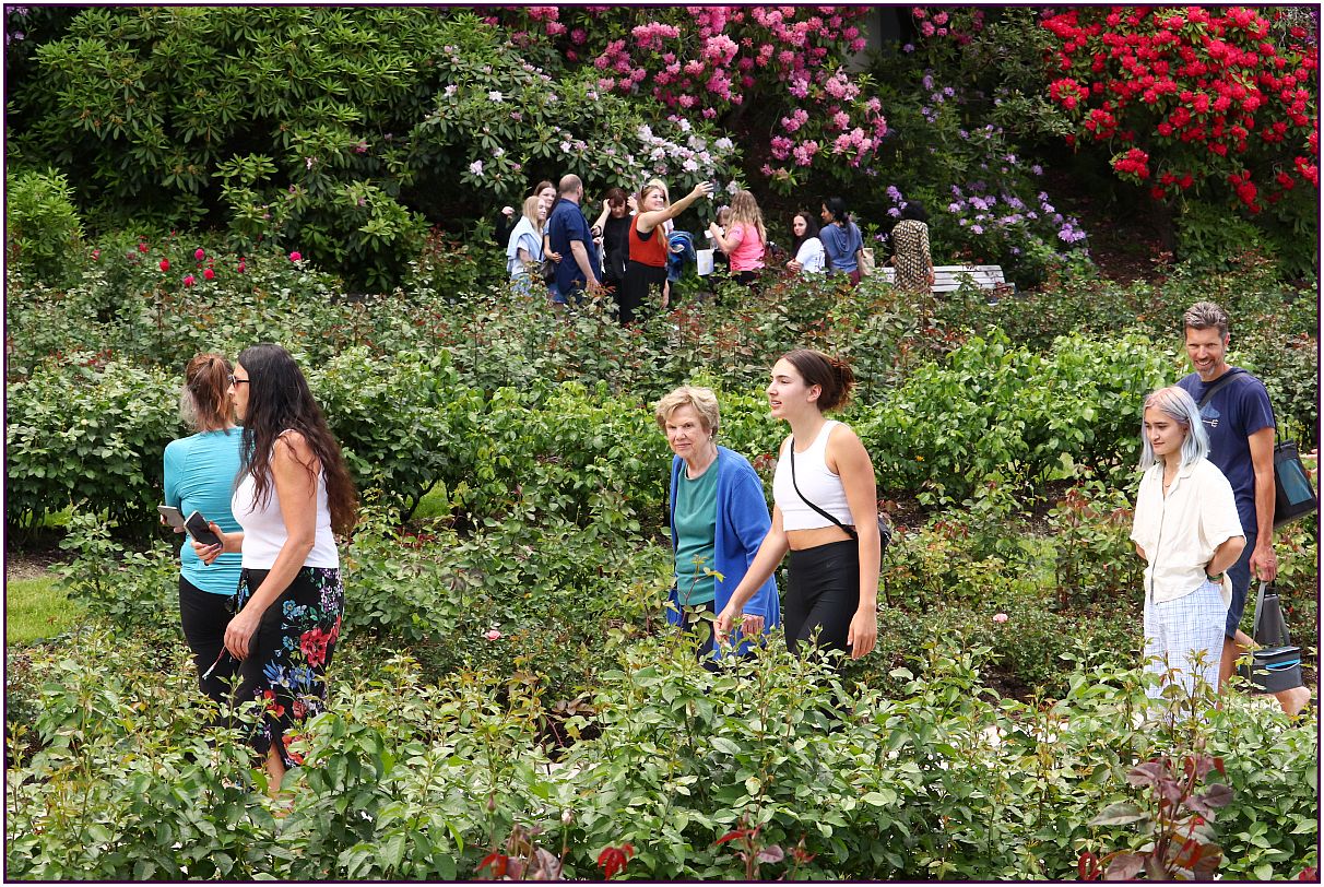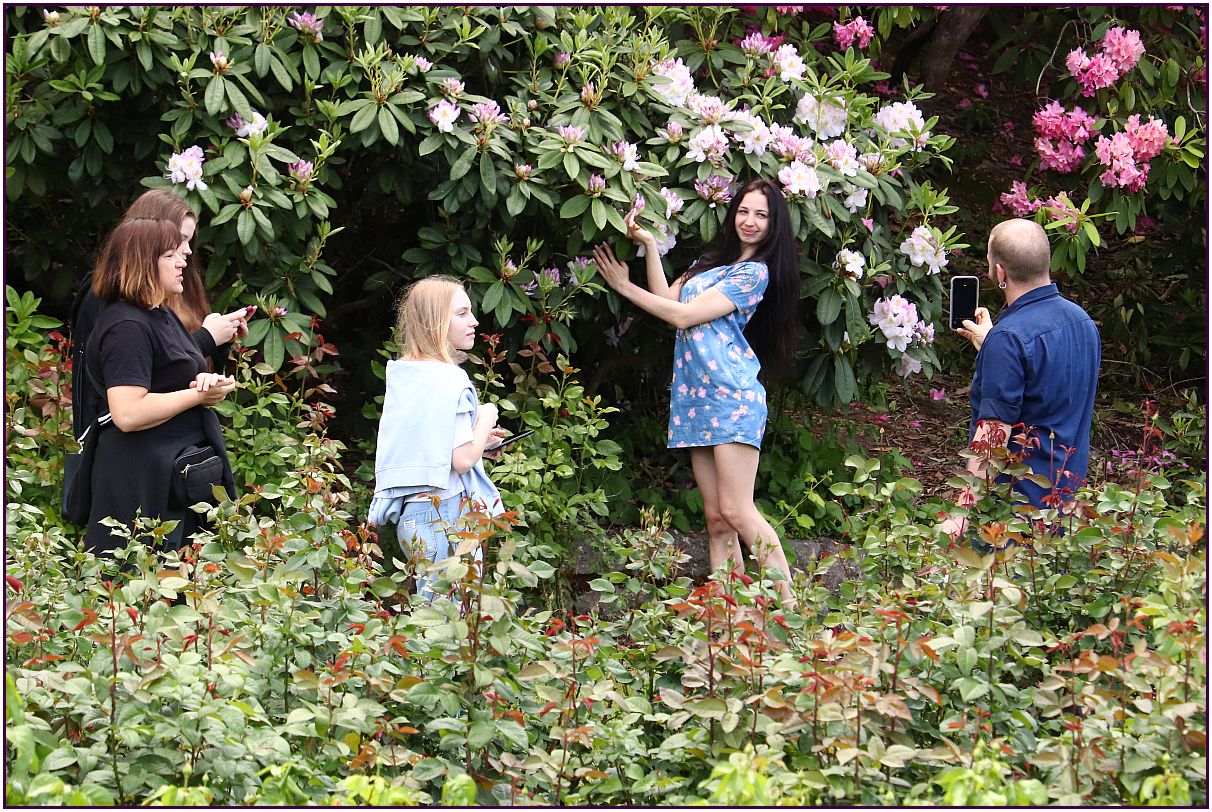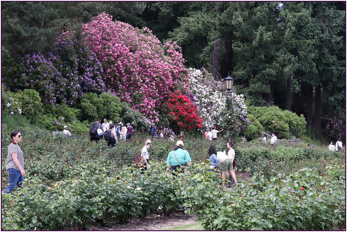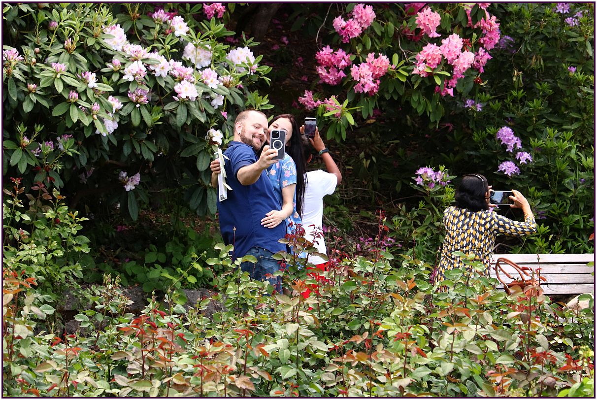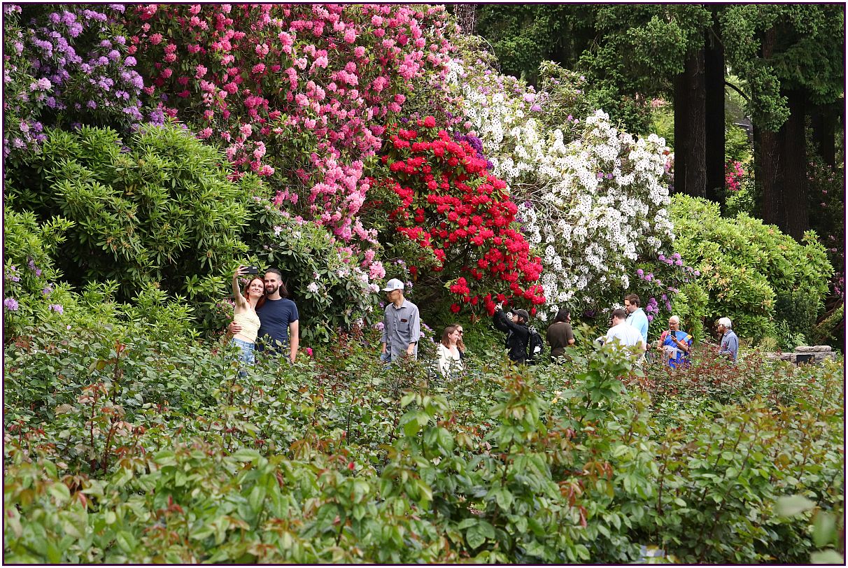 At the end of May I got a chance to see a rhododendron wall at our local rose garden. I caught it at its peak or nearly so. I brought with me four cameras and four lenses, just so I could play around with them. Two cameras and lenses would have been fine otherwise.