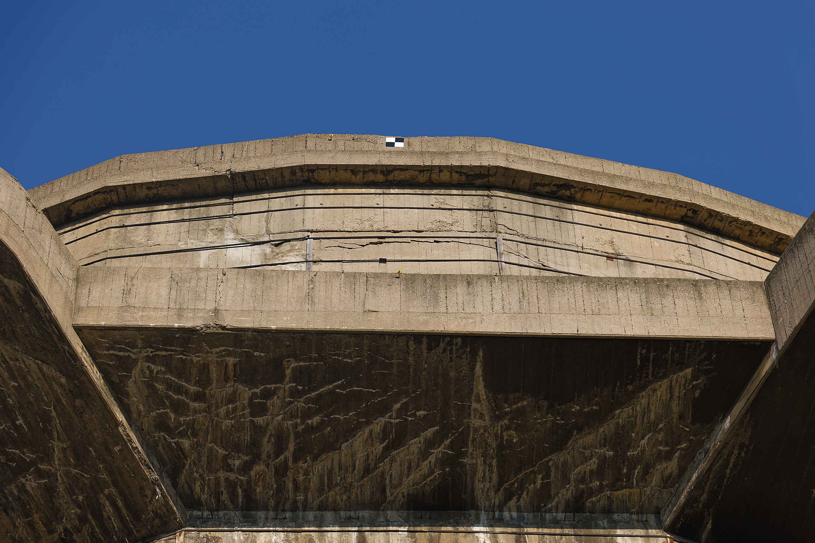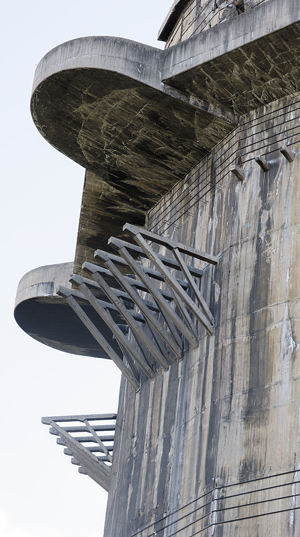 The towers were built in pairs from reinforced concrete with walls 8ft thick. The two towers that I photographed yesterday are 400 metres apart in the Augarten. This is a large park in the city with forested areas divided by tall hedges and gravel paths. One (the Feuerleitturm) is 172 ft high for radar, and the other (the Gefechtsturm) is 180 ft high for artillery. At the end of the war it was decided that these towers were indestructible, so they have remained in place. A few years later, an explosion in the Gefechtsturm raised the roof -- literally -- and it then fell back again, causing damage, which has been contained by means of wires stretched around the tower.