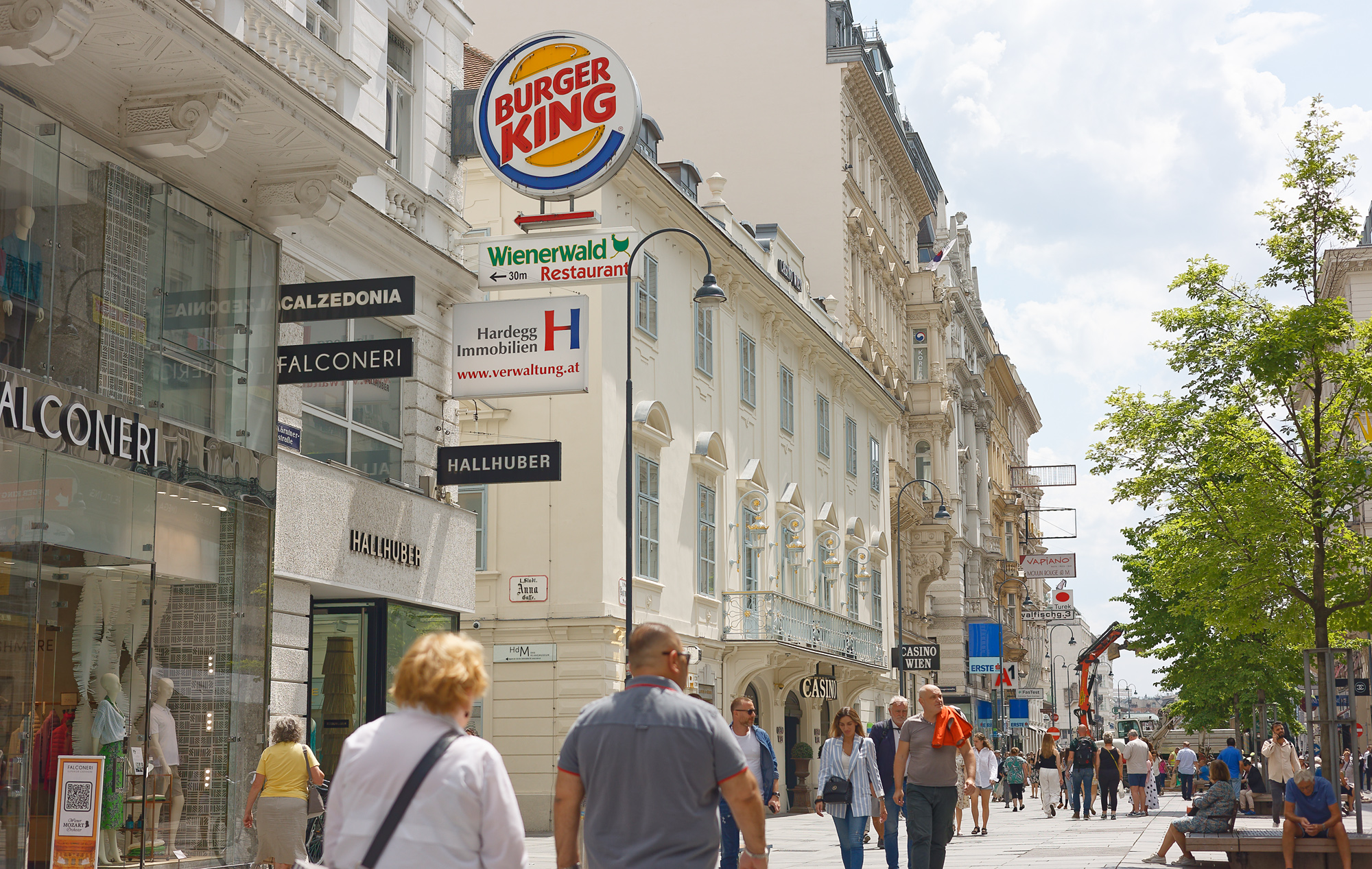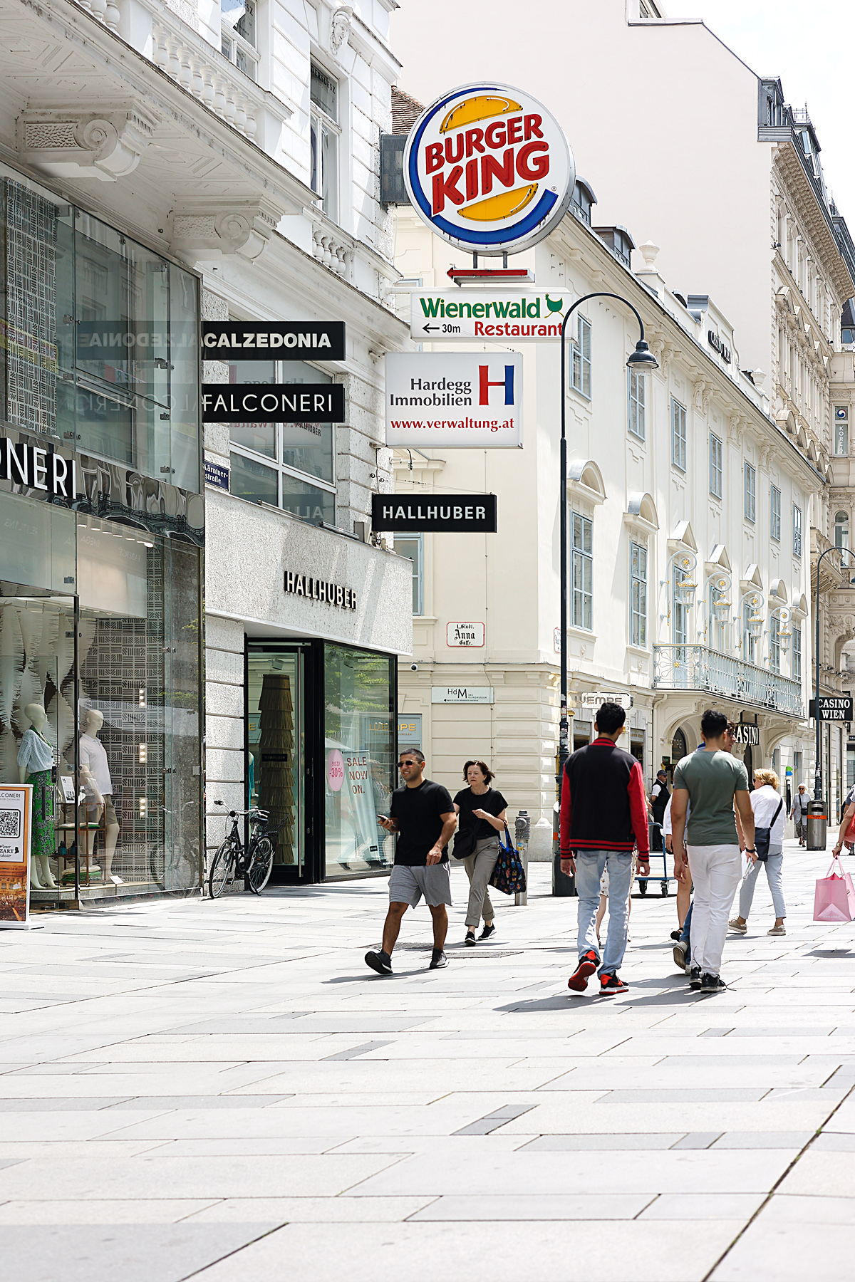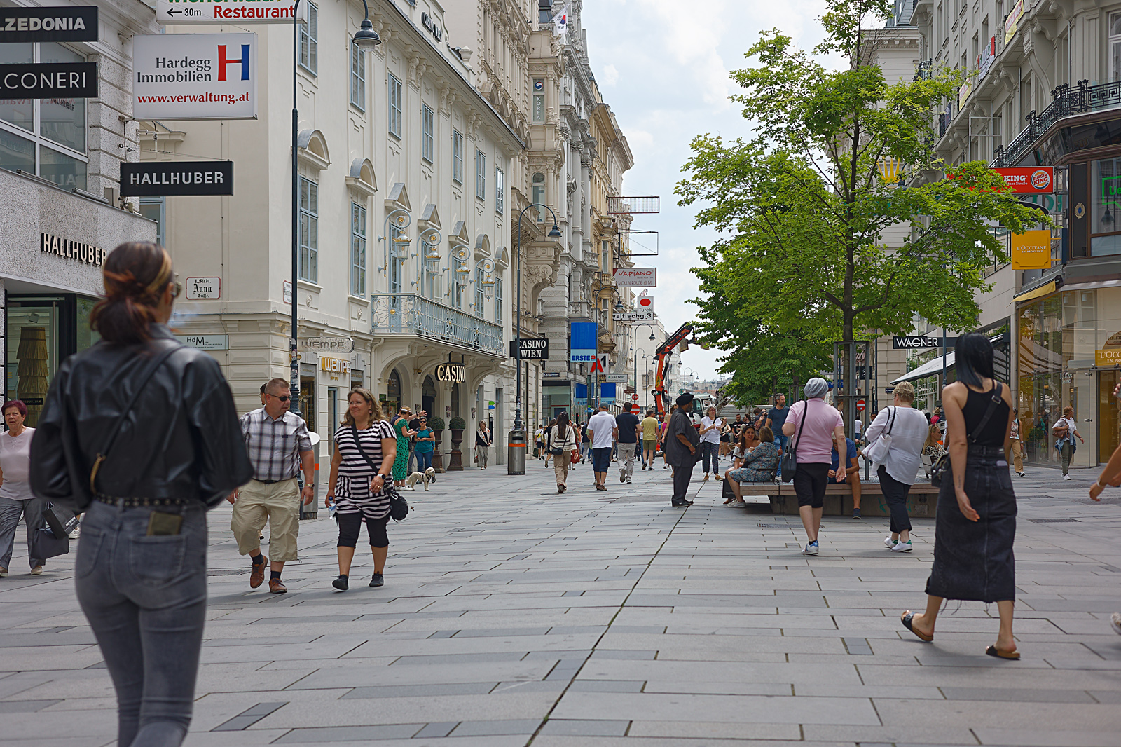 About twenty minutes later, in the centre of the city, on Kärntnerstrasse, I found something that, by backing up as far as possible I can take in with the 50mm. For many decades this was the HMV Shop, the most comprehensive record store in Vienna. I suppose its high prices and high rents caused this shop to close about two years ago. It was then replaced by one selling traditional Austrian clothes (Tracht and Dirndl); but that didnt last very long, and has itself been replaced by: