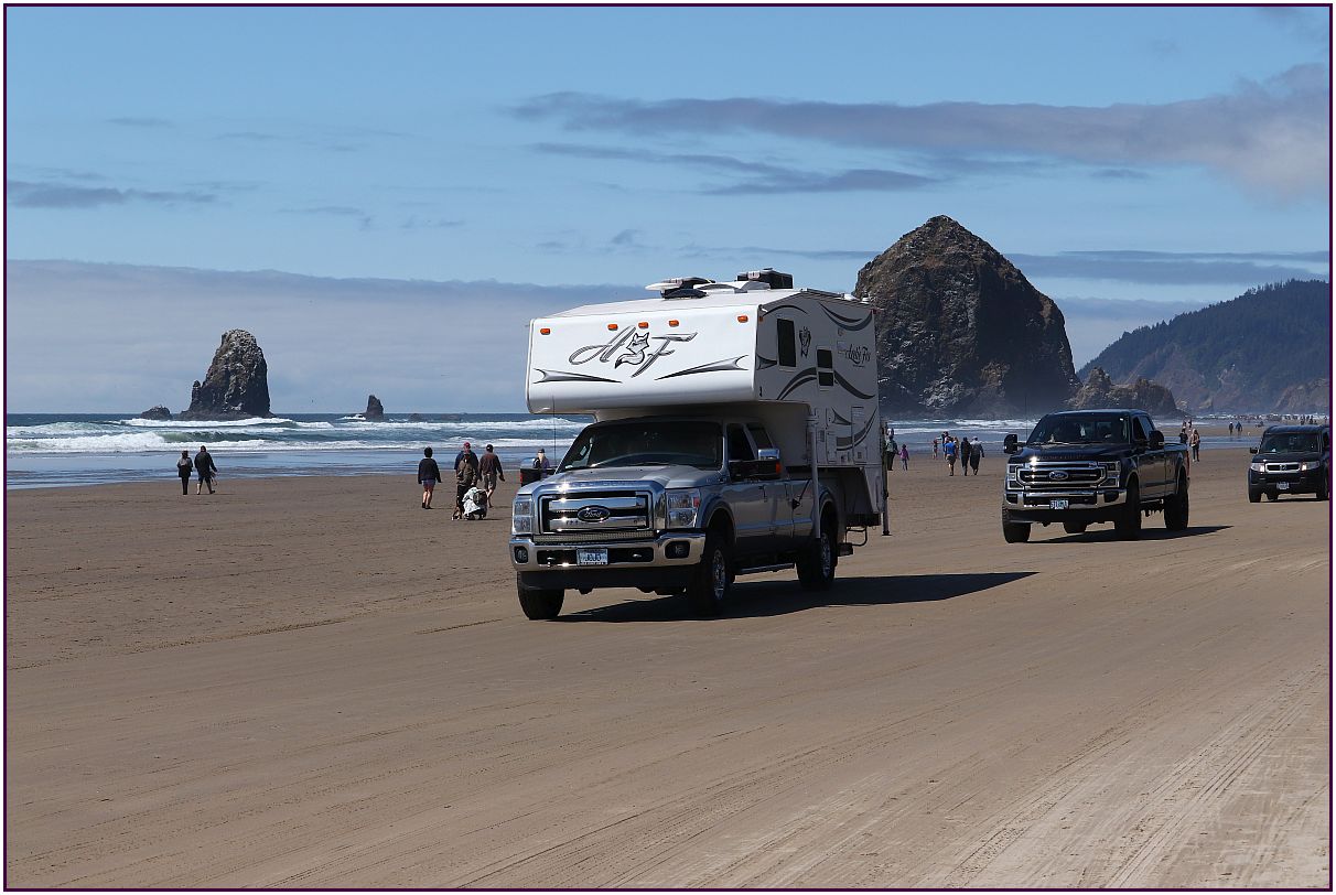 Photo No. 1 - As I walked north towards the sand castles, we see these automobiles. The authorities permitted them to be on the beach because of this special activity. You can see Haystock Rock in the background.