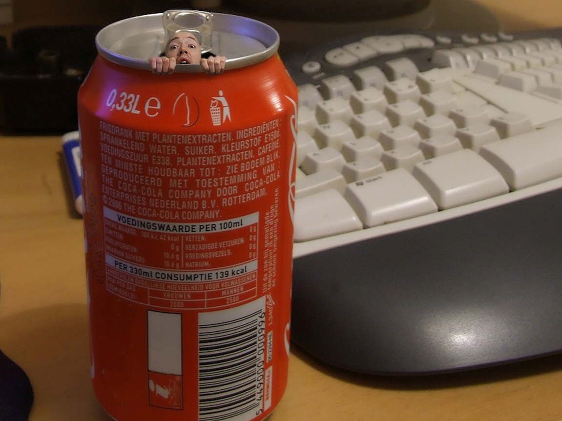 Thanks! It isnt that hard to do really. First I made a selfie via the timer, with the camera set above my head on the bathroom closet with the shower curtain rod in/before my hands/face. Second I made the capture with the can sorta how I had envisioned the final composition, tinkered with both shots and made a few different captures until I had two that matched in wb and sharpness. Then downsized the bathroom picture until the size of my head fitted the can opening (somewhat convincingly). And then added the downsized selfie to the can image as an extra layer behind the can layer after which I aligned them exactly with my head behind the can opening (with the can layer at 50% opacity/see through) and then erased the pixels in front of the selfie in such a way that my hands seemed to be around the edge of the can instead of the curtain rod.