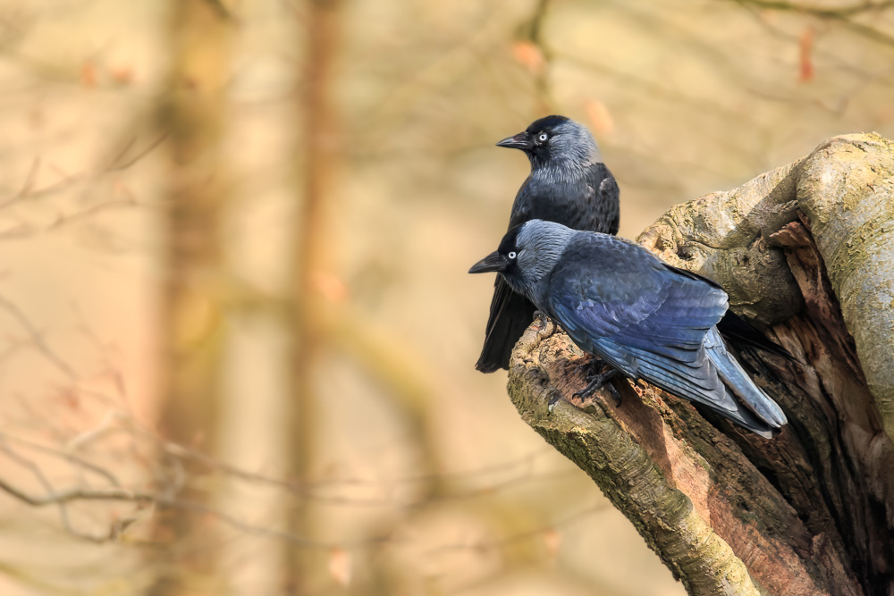 Jackdaws in the forest. (Aperture f/6.3 <> (SS): 1/800 <> ISO 1250 <> EC: 0 <> PASM Mode: Shutter Priority <> Metering: Partial <> Focus Mode: AI Servo <> FL: 600mm <> Lens: Tamron SP 150-600mm f/5-6.3 Di VC USD <> Camera ID: Canon EOS 70D).