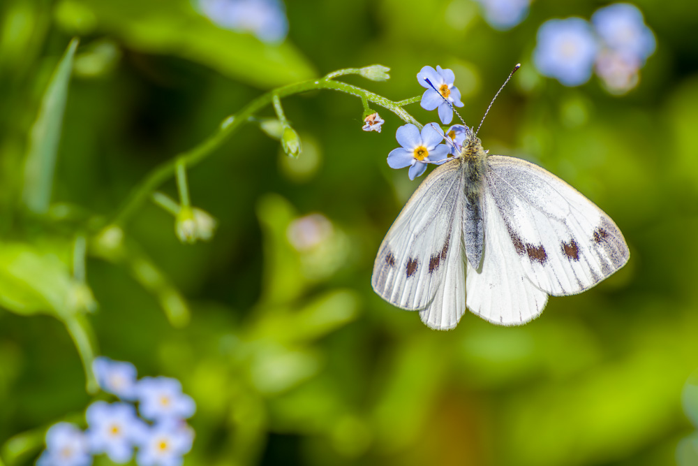 A 'Small White' on Forget-me-nots. (Aperture f/8 <> (SS): 1/400 <> ISO 160 <> EC: 0 <> PASM Mode: Aperture Priority <> Metering: Evaluative <> Focus Mode: One Shot <> FL: 300mm <> Lens: Tamron SP 70-300mm f/4-5.6 Di VC USD <> Camera ID: Canon EOS 7D Mark II).