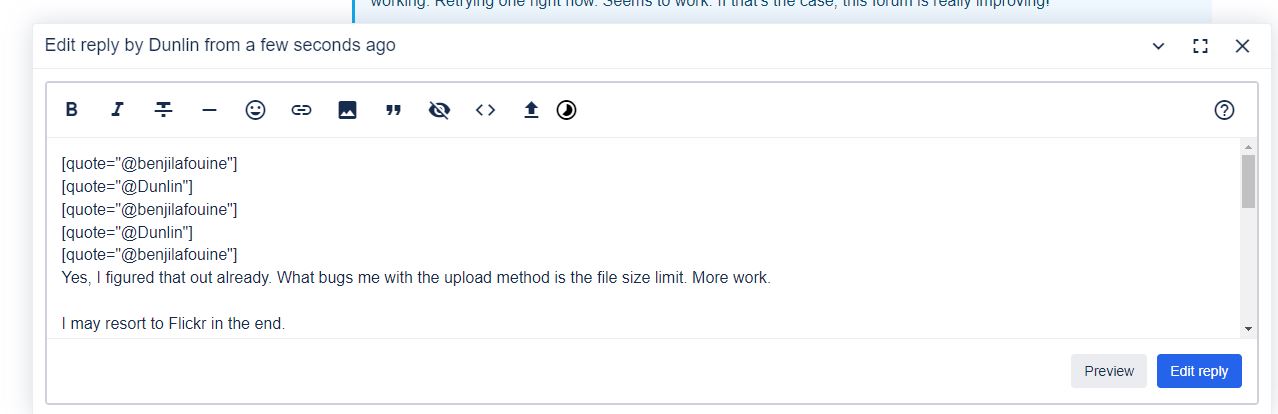 Now we’re talking. While we’re on the subject, I noticed that uploaded files need to be clicked on to be viewed. Is there a way to change that behaviour? Also, I tried last month to link a photo from my OneDrive drive and it wasn’t working. Retrying one right now. Seems to work. If that’s the case, this forum is really improving!
