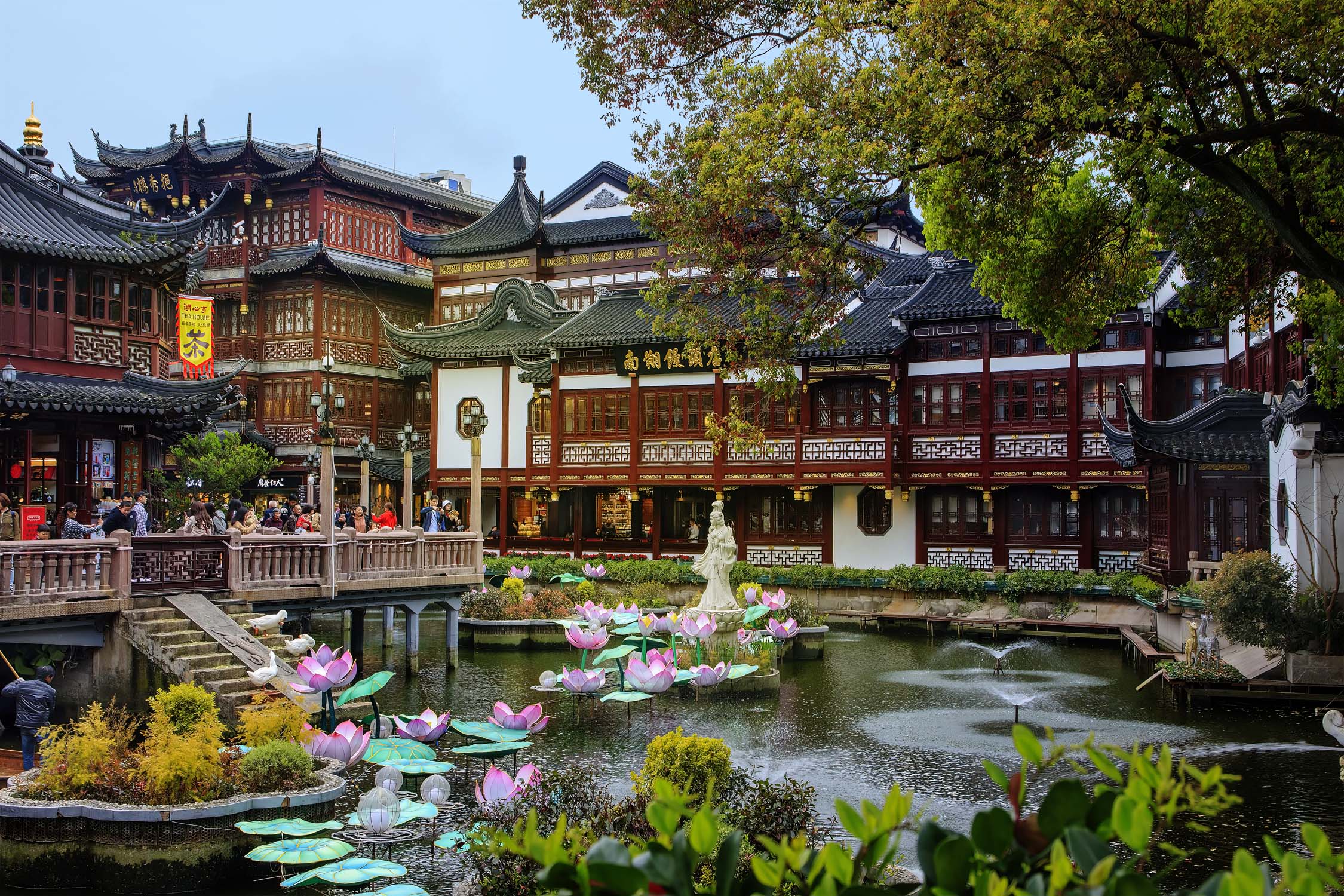 This is one view of Yuyuan Garden (Shanghai) with part of its famous Jiuqu Bridge on the left.
