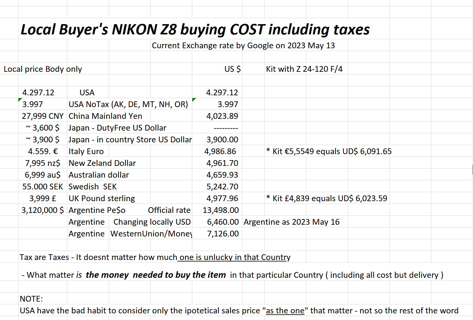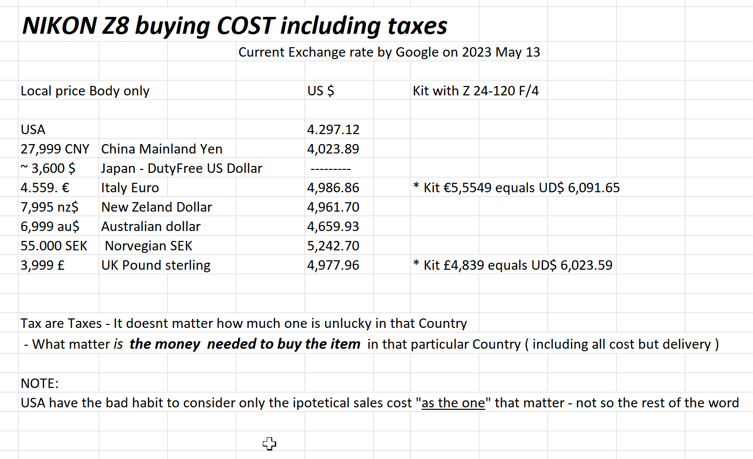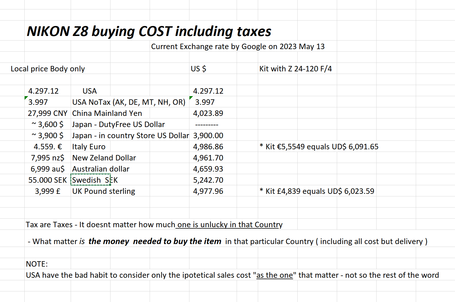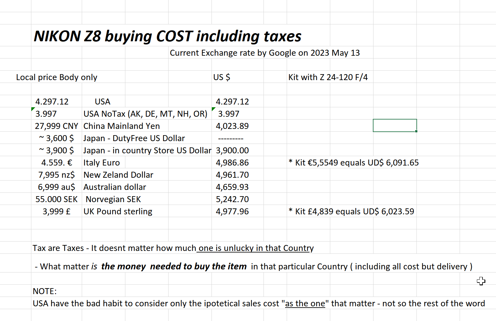 Yes, I like the “thirty ways to Sunday” point, and that is what I’m trying to get at too, the no schemes, no tricks legitimate price to buy. In other words, what is the lowest legal buying cost for the camera in the US, whilst maintaining your Nikon USA warranty, ability to send it to them and have it repaired at any point in the future. Ans: ~US $3997, and this is a representative US price to include in the OP’s spreadsheet.